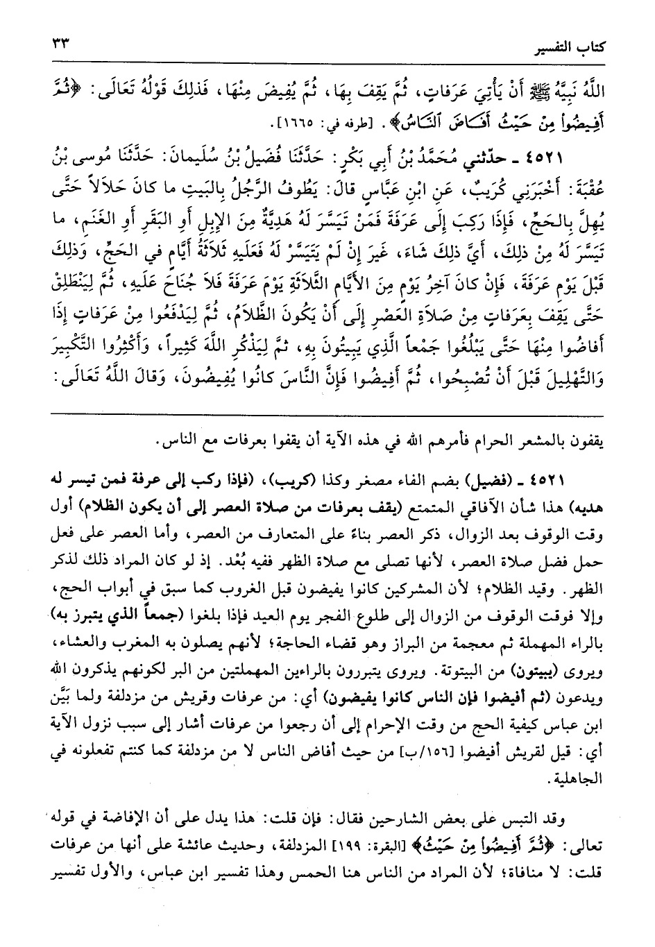 4521 - (فضيل) بضم الفاء مصغر وكذا (كريب)، (فإذا ركب إلى عرفة فمن تيسر له هديه) هذا شأن الآفاقي المتمتع (يقف بعرفات من صلاة العصر إلى أن يكون الظلام) أول وقت الوقوف بعد الزوال، ذكر العصر بناءً على المتعارف من العصر، وأما العصر على فعل حمل فضل صلاة العصر، لأنها تصلى مع صلاة الظهر ففيه بُعْد. إذ لو كان المراد ذلك لذكر الظهر. وقيد الظلام؛ لأن المشركين كانوا يفيضون قبل الغروب كما سبق في أبواب الحج، وإلا فوقت الوقوف من الزوال إلى طلوع الفجر يوم العيد فإذا بلغوا (جمعًا الذي يتبرز به) بالراء المهملة ثم معجمة من البراز وهو قضاء الحاجة؛ لأنهم يصلون به المغرب والعشاء، ويروى (يبيتون) من البيتوتة. ويروى يتبررون بالراءين المهملتين من البر لكونهم يذكرون الله ويدعون (ثم أفيضوا فإن الناس كانوا يفيضون) أي: من عرفات وقريش من مزدلفة ولما بَيَّن ابن عباس كيفية الحج من وقت الإحرام إلى أن رجعوا من عرفات أشار إلى سبب نزول الآية أي: قيل لقريش أفيضوا من حيث أفاض الناس لا من مزدلفة كما كنتم تفعلونه في الجاهلية.