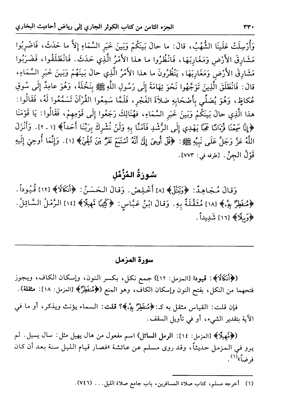 ({مَهِيلًا} [المزمل: 14]: الرمل السائل) اسم مفعول من هال يهيل مثل: سال يسيل. لم يرو في المزمل حديثًا، وقد روى مسلم عن عائشة "فصار قيام الليل سنة بعد أن كان فرضًا".