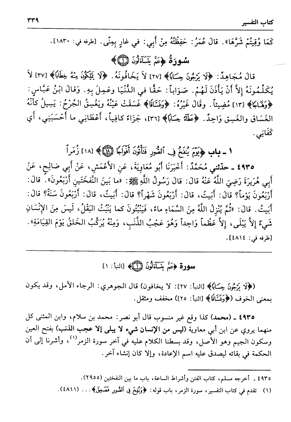 4935 - حَدَّثَنِى مُحَمَّدٌ أَخْبَرَنَا أَبُو مُعَاوِيَةَ عَنِ الأَعْمَشِ عَنْ أَبِى صَالِحٍ عَنْ أَبِى هُرَيْرَةَ - رضى الله عنه - قَالَ قَالَ رَسُولُ اللَّهِ - صلى الله عليه وسلم - «مَا بَيْنَ النَّفْخَتَيْنِ أَرْبَعُونَ». قَالَ أَرْبَعُونَ يَوْمًا قَالَ أَبَيْتُ. قَالَ أَرْبَعُونَ شَهْرًا قَالَ أَبَيْتُ. قَالَ أَرْبَعُونَ سَنَةً قَالَ أَبَيْتُ. قَالَ «ثُمَّ يُنْزِلُ اللَّهُ مِنَ السَّمَاءِ مَاءً. فَيَنْبُتُونَ كَمَا يَنْبُتُ الْبَقْلُ لَيْسَ مِنَ الإِنْسَانِ شَىْءٌ إِلاَّ يَبْلَى إِلاَّ عَظْمًا وَاحِدًا وَهْوَ عَجْبُ الذَّنَبِ، وَمِنْهُ يُرَكَّبُ الْخَلْقُ يَوْمَ الْقِيَامَةِ». طرفه 4814