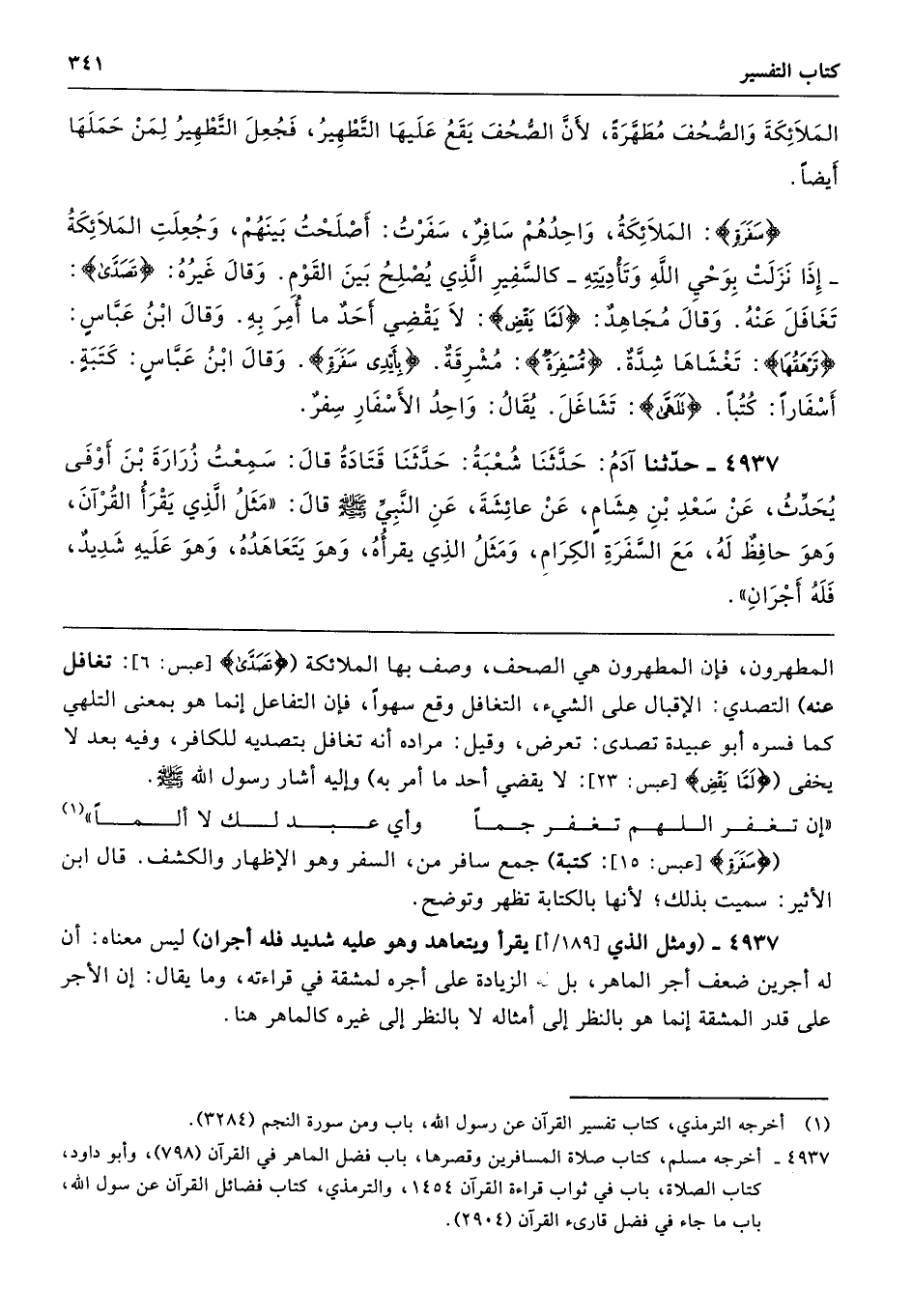 ({سَفَرَةٍ} [عبس: 15] كتبة) جمع سافر من، السفر وهو الإظهار والكشف. قال ابن الأثير: سميت بذلك؛ لأنها بالكتابة تظهر وتوضح.