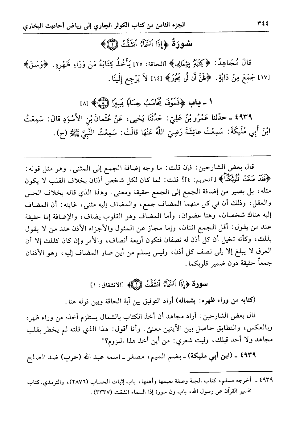 قال بعض الشارحين: أراد مجاهد أن أخذ الكتاب بالشمال يستلزم أخذه من وراء ظهره وبالعكس، والتطابق حاصل بين الآيتين معنىً. وأنا أقول: هذا الذي قلته لم يخطر بقلب مجاهد ولا أحد قبلك، وليت شعري: من أين أخذ هذا اللزوم؟!