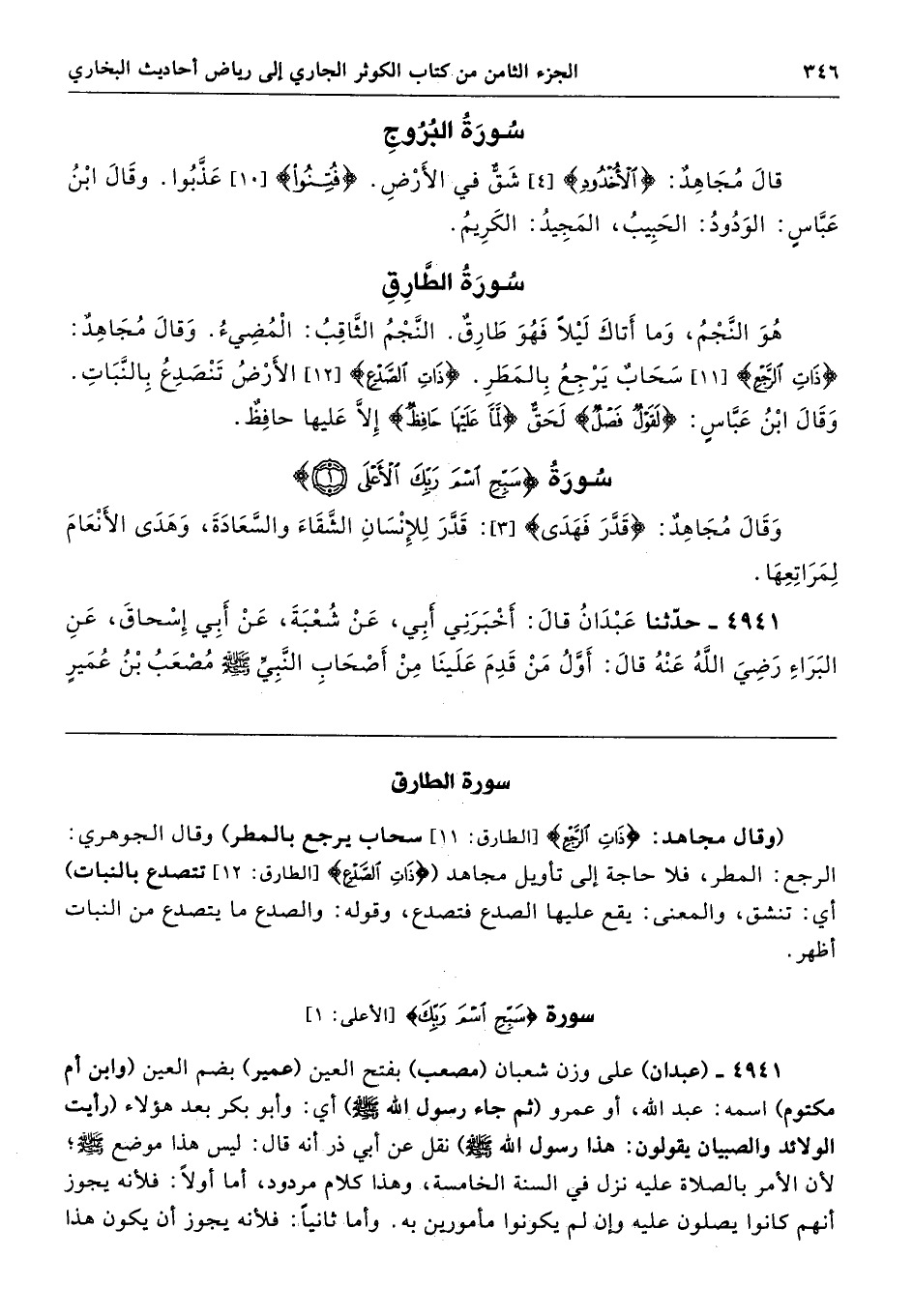 هو النجم، وما أتاك ليلا فهو طارق. النجم الثاقب: المضيء. وَقَالَ مُجَاهِدٌ: {ذَاتِ الرَّجْعِ} [الطارق: 11]: «سَحَابٌ يَرْجِعُ بِالْمَطَرِ»، {ذَاتِ الصَّدْعِ} [الطارق: 12]: «تَتَصَدَّعُ بِالنَّبَاتِ».