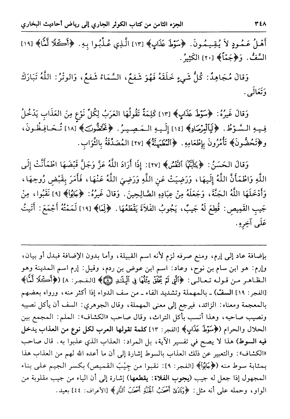بإضافة عاد إلى إرم، ومنع صرفه لزم لأنه اسم القبيلة، وأما بدون الإضافة فبدل أو بيان، وإرم: هو ابن سام بن نوح، وعاد: اسم ابن عوض بن ردم، وقيل: إرم اسم المدينة وهو الظاهر من قوله تعالى: {الَّتِي لَمْ يُخْلَقْ مِثْلُهَا فِي الْبِلَادِ (8)} [الفجر: 8] ({أَكْلًا لَمًّا} [الفجر: 19] السفّ) -بالمهملة وتشديد الفاء- من سف الدواء إذا أكثر منه، ورواه بعضهم بالمعجمة ومعناه: الزائد، فيرجع إلى معنى المهملة، وقال الجوهري: السف أن يأكل نصيبه ونصيب صاحبه، وهذا أنسب بأكل التراث، وقال صاحب "الكشاف": الملم: المجمع بين الحلال والحرام ({سَوْطَ عَذَابٍ} [الفجر: 13] كلمة تقولها العرب لكل نوع من العذاب يدخل فيه السوط) هذا لا يصح في تفسير الآية، بل المراد: العذاب الذي عذبوا به. قال صاحب "الكشاف": والتعبير عن ذلك العذاب بالسوط إشارة إلى أن ما أعده الله لهم من العذاب هذا بمثابة سوط منه {جَابُوا} [الفجر: 9]: نقبوا من جِيبَ القميص) بكسر الجيم على بناء المجهول إذا جعل له جيب (يجوب الفلاة: يقطعها) إشارة إلى أن الياء من جيب مقلوبة من الواو، وحمله على أنه مثل: {وَنَادَى أَصْحَابُ الْجَنَّةِ أَصْحَابَ النَّارِ} [الأعراف: 44] بعيد.