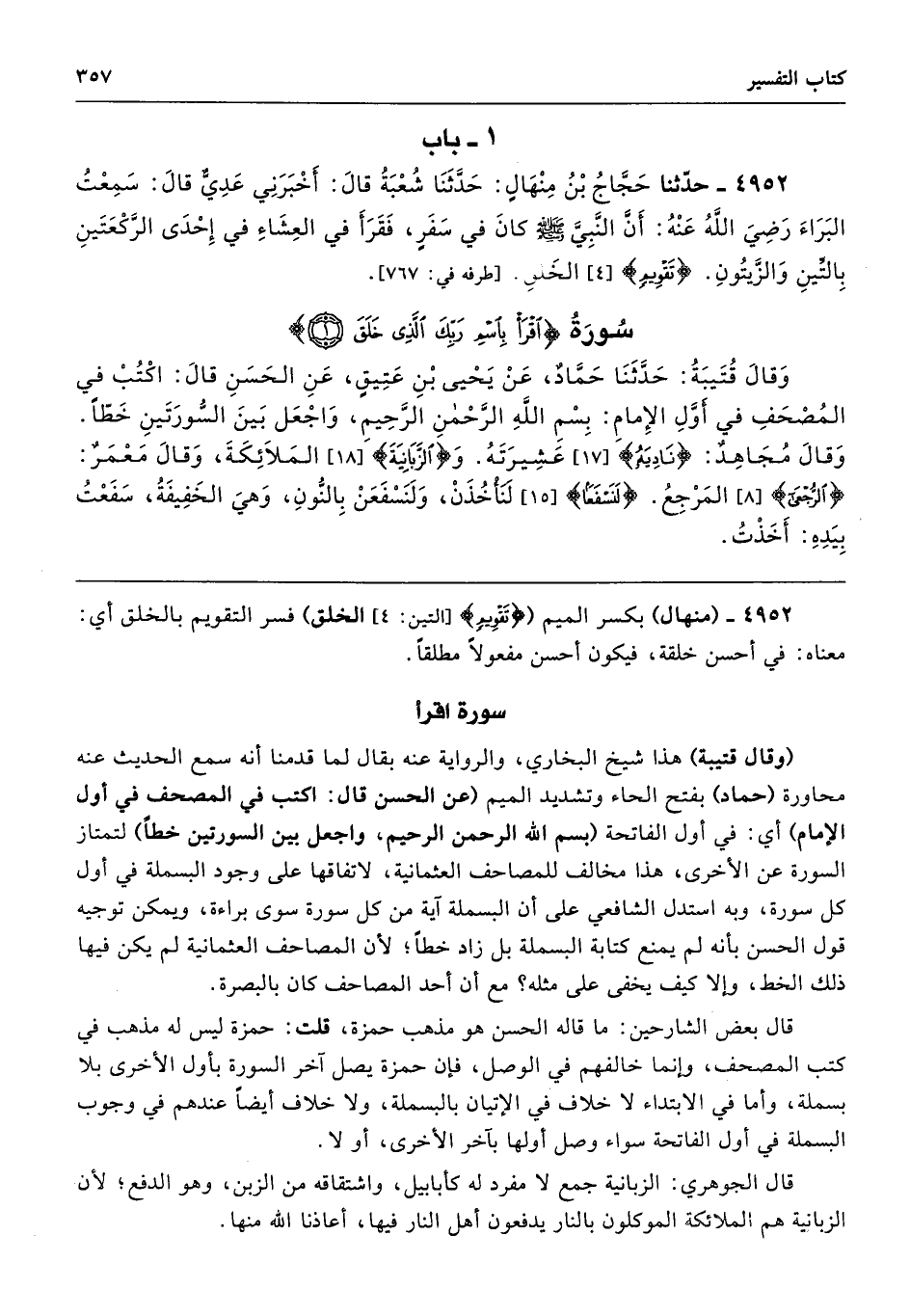 وَقَالَ قُتَيْبَةُ حَدَّثَنَا حَمَّادٌ عَنْ يَحْيَى بْنِ عَتِيقٍ عَنِ الْحَسَنِ قَالَ اكْتُبْ فِي الْمُصْحَفِ فِي أَوَّلِ الإِمَامِ بِسْمِ اللَّهِ الرَّحْمَنِ الرَّحِيمِ، وَاجْعَلْ بَيْنَ السُّورَتَيْنِ خَطًّا. وَقَالَ مُجَاهِدٌ (نَادِيَهُ) عَشِيرَتَهُ. (الزَّبَانِيَةَ) الْمَلاَئِكَةَ. وَقَالَ مَعْمَرٌ (الرُّجْعَى) الْمَرْجِعُ. (لَنَسْفَعَنْ) قَالَ لَنَأْخُذَنْ وَلَنَسْفَعَنْ بِالنُّونِ وَهْىَ الْخَفِيفَةُ، سَفَعْتُ بِيَدِهِ أَخَذْتُ.