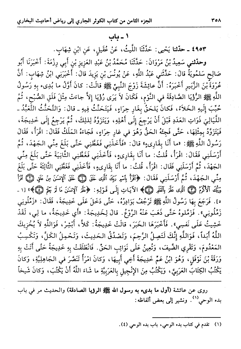 4953 - حَدَّثَنَا يَحْيَى حَدَّثَنَا اللَّيْثُ عَنْ عُقَيْلٍ عَنِ ابْنِ شِهَابٍ حَدَّثَنِى سَعِيدُ بْنُ مَرْوَانَ حَدَّثَنَا مُحَمَّدُ بْنُ عَبْدِ الْعَزِيزِ بْنِ أَبِى رِزْمَةَ أَخْبَرَنَا أَبُو صَالِحٍ سَلْمَوَيْهِ قَالَ حَدَّثَنِى عَبْدُ اللَّهِ عَنْ يُونُسَ بْنِ يَزِيدَ قَالَ أَخْبَرَنِى ابْنُ شِهَابٍ أَنَّ عُرْوَةَ بْنَ الزُّبَيْرِ أَخْبَرَهُ أَنَّ عَائِشَةَ زَوْجَ النَّبِيِّ - صلى الله عليه وسلم - قَالَتْ كَانَ أَوَّلُ مَا بُدِئَ بِهِ رَسُولُ اللَّهِ - صلى الله عليه وسلم - الرُّؤْيَا الصَّادِقَةُ فِي النَّوْمِ، فَكَانَ لاَ يَرَى رُؤْيَا إِلاَّ جَاءَتْ مِثْلَ فَلَقِ الصُّبْحِ، ثُمَّ حُبِّبَ إِلَيْهِ الْخَلاَءُ فَكَانَ يَلْحَقُ بِغَارِ حِرَاءٍ فَيَتَحَنَّثُ فِيهِ - قَالَ وَالتَّحَنُّثُ التَّعَبُّدُ - اللَّيَالِىَ ذَوَاتِ الْعَدَدِ قَبْلَ أَنْ يَرْجِعَ إِلَى أَهْلِهِ، وَيَتَزَوَّدُ لِذَلِكَ، ثُمَّ يَرْجِعُ إِلَى خَدِيجَةَ فَيَتَزَوَّدُ بِمِثْلِهَا، حَتَّى فَجِئَهُ الْحَقُّ وَهْوَ فِي غَارِ حِرَاءٍ فَجَاءَهُ الْمَلَكُ فَقَالَ اقْرَأْ. فَقَالَ رَسُولُ اللَّهِ - صلى الله عليه وسلم - «مَا أَنَا بِقَارِئٍ». قَالَ «فَأَخَذَنِى فَغَطَّنِى حَتَّى بَلَغَ مِنِّى الْجُهْدُ ثُمَّ أَرْسَلَنِى. فَقَالَ اقْرَأْ. قُلْتُ مَا أَنَا بِقَارِئٍ. فَأَخَذَنِى فَغَطَّنِى الثَّانِيِةَ حَتَّى بَلَغَ مِنِّى الْجُهْدُ، ثُمَّ أَرْسَلَنِى. فَقَالَ اقْرَأْ. قُلْتُ مَا أَنَا بِقَارِئٍ. فَأَخَذَنِى فَغَطَّنِى الثَّالِثَةَ حَتَّى بَلَغَ مِنِّى الْجُهْدُ ثُمَّ أَرْسَلَنِى. فَقَالَ (اقْرَأْ بِاسْمِ رَبِّكَ الَّذِى خَلَقَ * خَلَقَ الإِنْسَانَ مِنْ عَلَقٍ * اقْرَأْ وَرَبُّكَ الأَكْرَمُ * الَّذِى عَلَّمَ بِالْقَلَمِ)». الآيَاتِ إِلَى قَوْلِهِ (عَلَّمَ الإِنْسَانَ مَا لَمْ يَعْلَمْ) فَرَجَعَ بِهَا رَسُولُ اللَّهِ - صلى الله عليه وسلم - تَرْجُفُ بَوَادِرُهُ حَتَّى دَخَلَ عَلَى خَدِيجَةَ فَقَالَ «زَمِّلُونِى زَمِّلُونِى». فَزَمَّلُوهُ حَتَّى ذَهَبَ عَنْهُ الرَّوْعُ قَالَ لِخَدِيجَةَ «أَىْ خَدِيجَةُ مَا لِى، لَقَدْ خَشِيتُ عَلَى نَفْسِى». فَأَخْبَرَهَا الْخَبَرَ. قَالَتْ خَدِيجَةُ كَلاَّ أَبْشِرْ، فَوَاللَّهِ لاَ يُخْزِيكَ اللَّهُ أَبَدًا، فَوَاللَّهِ إِنَّكَ لَتَصِلُ الرَّحِمَ، وَتَصْدُقُ الْحَدِيثَ، وَتَحْمِلُ الْكَلَّ، وَتَكْسِبُ الْمَعْدُومَ، وَتَقْرِى الضَّيْفَ، وَتُعِينُ عَلَى نَوَائِبِ الْحَقِّ. فَانْطَلَقَتْ بِهِ خَدِيجَةُ حَتَّى أَتَتْ بِهِ وَرَقَةَ بْنَ نَوْفَلٍ وَهْوَ ابْنُ عَمِّ خَدِيجَةَ أَخِى أَبِيهَا، وَكَانَ امْرَأً تَنَصَّرَ فِي الْجَاهِلِيَّةِ، وَكَانَ يَكْتُبُ الْكِتَابَ الْعَرَبِىَّ وَيَكْتُبُ مِنَ الإِنْجِيلِ بِالْعَرَبِيَّةِ مَا شَاءَ اللَّهُ أَنْ يَكْتُبَ، وَكَانَ شَيْخًا