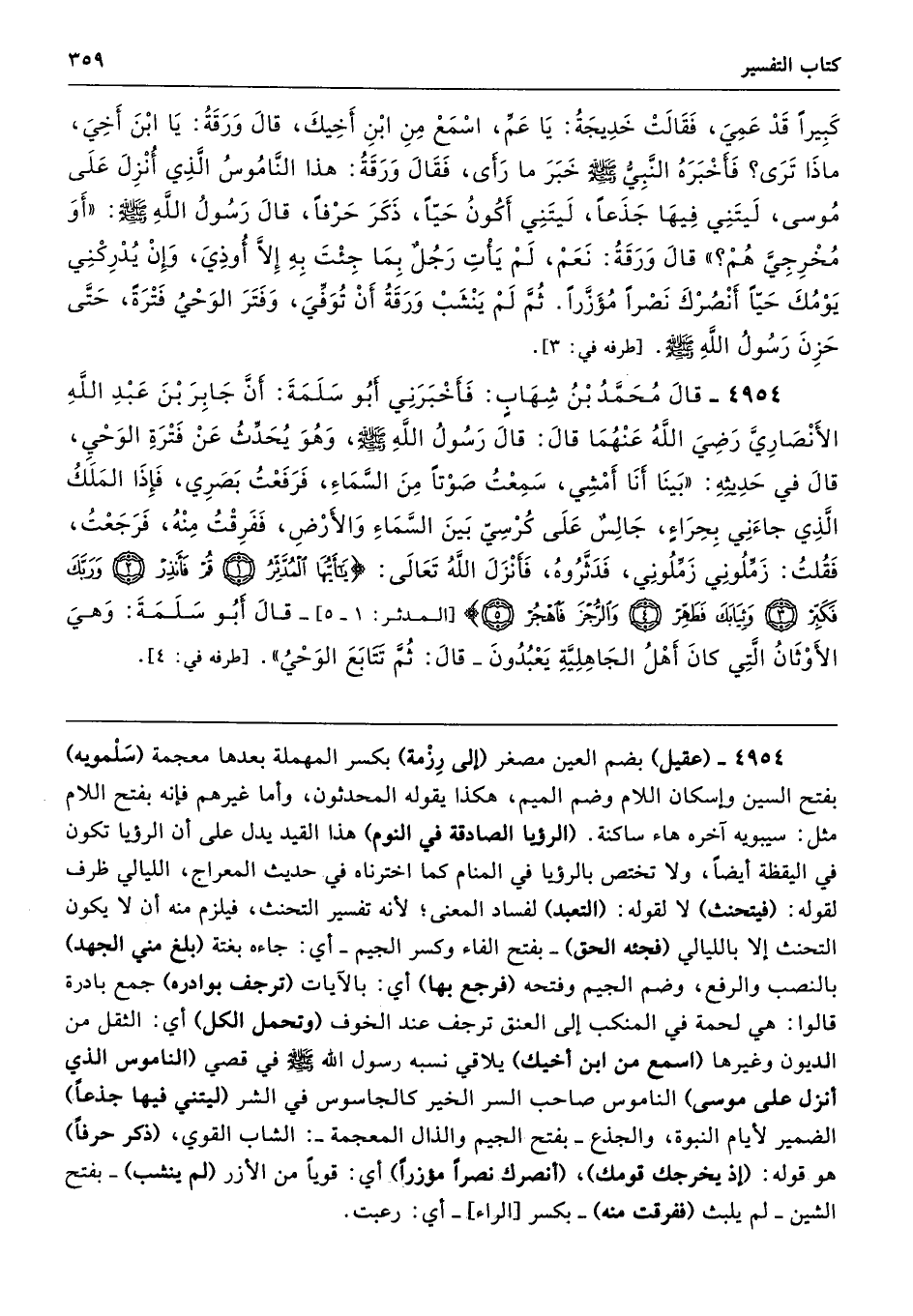 4954 - (عقيل) بضم العين مصغر (إلى رِزْمة) بكسر المهملة بعدها معجمة (سَلْمويه) بفتح السين وإسكان اللام وضم الميم، هكذا يقوله المحدثون، وأما غيرهم فإنه بفتح اللام مثل: سيبويه آخره هاء ساكنة. (الرؤيا الصادقة في النوم) هذا القيد يدل على أن الرؤيا تكون في اليقظة أيضًا، ولا تختص بالرؤيا في المنام كما اخترناه في حديث المعراج، الليالي ظرف لقوله: (فيتحنث) لا لقوله: (التعبد) لفساد المعنى؛ لأنه تفسير التحنث، فيلزم منه أن لا يكون التحنث إلا بالليالي (فجئه الحق) -بفتح الفاء وكسر الجيم- أي: جاءه بغتة (بلغ مني الجهد) بالنصب والرفع، وضم الجيم وفتحه (فرجع بها) أي: بالآيات (ترجف بوادره) جمع بادرة قالوا: هي لحمة في المنكب إلى العنق ترجف عند الخوف (وتحمل الكل) أي: الثقل من الديون وغيرها (اسمع من ابن أخيك) يلاقي نسبه رسول الله - صلى الله عليه وسلم - في قصي (الناموس الذي أنزل على موسى) الناموس صاحب السر الخير كالجاسوس في الشر (ليتني فيها جذعًا) الضمير لأيام النبوة، والجذع -بفتح الجيم والذال المعجمة-: الشاب القوي، (ذكر حرفًا) هو قوله: (إذ يخرجك قومك)، (أنصرك نصرًا مؤزرًا) أي: قويًّا من الأزر (لم ينشب) -بفتح الشين- لم يلبث (ففرقت منه) -بكسر [الراء]- أي: رعبت.