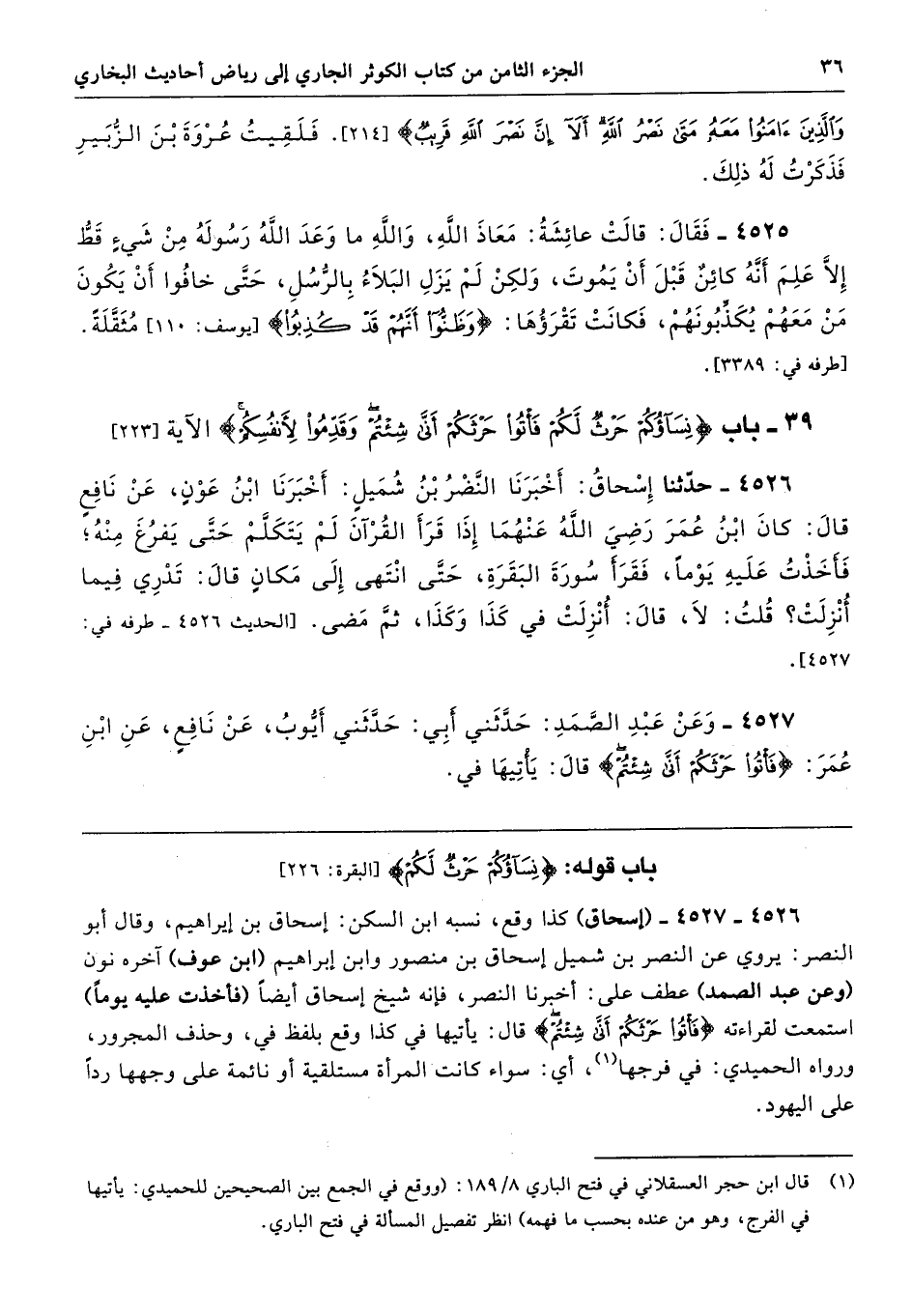 4526 - 4527 - (إسحاق) كذا وقع، نسبه ابن السكن: إسحاق بن إبراهيم، وقال أبو النصر: يروي عن النصر بن شميل إسحاق بن منصور وابن إبراهيم (ابن عوف) آخره نون (وعن عبد الصمد) عطف على: أخبرنا النصر، فإنه شيخ إسحاق أيضًا (فأخذت عليه يومًا) استمعت لقراءته {فَأْتُوا حَرْثَكُمْ أَنَّى شِئْتُمْ} قال: يأتيها في كذا وقع بلفظ في، وحذف المجرور، ورواه الحميدي: في فرجها، أي: سواء كانت المرأة مستلقية أو نائمة على وجهها ردًّا على اليهود.