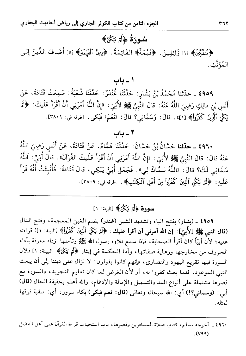 4959 - (بشار) بفتح الباء وتشديد الشين (فندر) بضم الغين المعجمة، وفتح الدال (قال النبي - صلى الله عليه وسلم -[لأبيّ]: إن الله أمرني أن أقرأ عليك: {لَمْ يَكُنِ الَّذِينَ كَفَرُوا} [البينة:1] قراءته عليه؛ لأن أبيًّا كان أقرأ الصحابة، فإذا سمع تلاوة رسول الله - صلى الله عليه وسلم - وتأملها ازداد معرفة بأداء الحروف من مخارجها ورعاية صفاتها، وأما الحكمة في إيثار {لمْ يَكُنِ} [البينة: 1] فلأن السورة فيها تقريع اليهود والنصارى، فإنهم كانوا يقولون: لا نزال على ديننا إلى أن يبعث النبي الموعود، فلما بعث كفروا به، أو لأن الغرض لما كان تعليم التجويد، والسورة مع قصرها مشتملة على أنواع المد والتسهيل والإمالة والإدغام، والله أعلم بحقيقة الحال (قال) أبي: (وسماني؟!) أي: الله سبحانه وتعالى (قال: نعم فبكى) بكاء سرور، أي: منقبة فوقها لمثله.