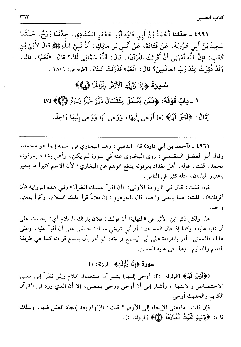 ({أَوْحَى لَهَا} [الزلزلة: 5]: أوحى إليها) يشير أن استعمال اللام وإلى نظرًا إلى معنى الاختصاص والانتهاء، وأشار إلى أن أوحى ووحى بمعنى، إلا أن الذي ورد في القرآن الكريم والحديث أوحى.
