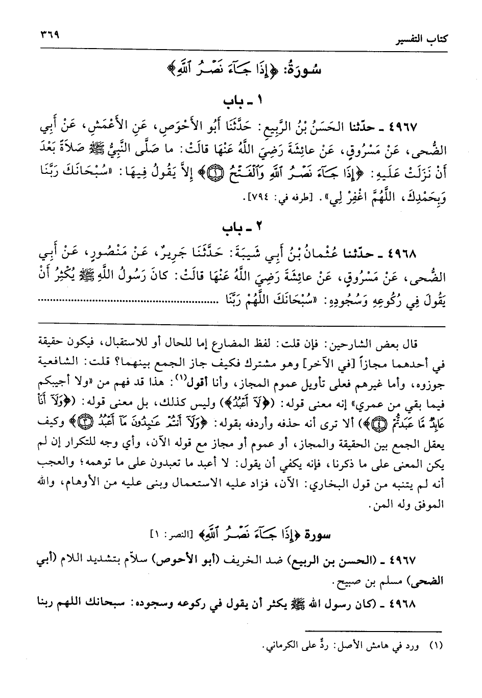 4967 - حَدَّثَنَا الْحَسَنُ بْنُ الرَّبِيعِ حَدَّثَنَا أَبُو الأَحْوَصِ عَنِ الأَعْمَشِ عَنْ أَبِى الضُّحَى عَنْ مَسْرُوقٍ عَنْ عَائِشَةَ - رضى الله عنها - قَالَتْ مَا صَلَّى النَّبِىُّ - صلى الله عليه وسلم - صَلاَةً بَعْدَ أَنْ نَزَلَتْ عَلَيْهِ (إِذَا جَاءَ نَصْرُ اللَّهِ وَالْفَتْحُ) إِلاَّ يَقُولُ فِيهَا «سُبْحَانَكَ رَبَّنَا وَبِحَمْدِكَ، اللَّهُمَّ اغْفِرْ لِى». طرفه 794