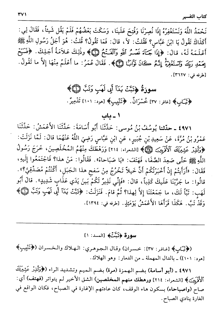 4971 - حَدَّثَنَا يُوسُفُ بْنُ مُوسَى حَدَّثَنَا أَبُو أُسَامَةَ حَدَّثَنَا الأَعْمَشُ حَدَّثَنَا عَمْرُو بْنُ مُرَّةَ عَنْ سَعِيدِ بْنِ جُبَيْرٍ عَنِ ابْنِ عَبَّاسٍ - رضى الله عنهما - قَالَ لَمَّا نَزَلَتْ (وَأَنْذِرْ عَشِيرَتَكَ الأَقْرَبِينَ) وَرَهْطَكَ مِنْهُمُ الْمُخْلَصِينَ، خَرَجَ رَسُولُ اللَّهِ - صلى الله عليه وسلم - حَتَّى صَعِدَ الصَّفَا فَهَتَفَ «يَا صَبَاحَاهْ». فَقَالُوا مَنْ هَذَا، فَاجْتَمَعُوا إِلَيْهِ. فَقَالَ «أَرَأَيْتُمْ إِنْ أَخْبَرْتُكُمْ أَنَّ خَيْلاً تَخْرُجُ مِنْ سَفْحِ هَذَا الْجَبَلِ أَكُنْتُمْ مُصَدِّقِىَّ». قَالُوا مَا جَرَّبْنَا عَلَيْكَ كَذِبًا. قَالَ «فَإِنِّى نَذِيرٌ لَكُمْ بَيْنَ يَدَىْ عَذَابٍ شَدِيدٍ». قَالَ أَبُو لَهَبٍ تَبًّا لَكَ مَا جَمَعْتَنَا إِلاَّ لِهَذَا ثُمَّ قَامَ فَنَزَلَتْ (تَبَّتْ يَدَا أَبِى لَهَبٍ وَتَبَّ) وَقَدْ تَبَّ هَكَذَا قَرَأَهَا الأَعْمَشُ يَوْمَئِذٍ. طرفه 1394