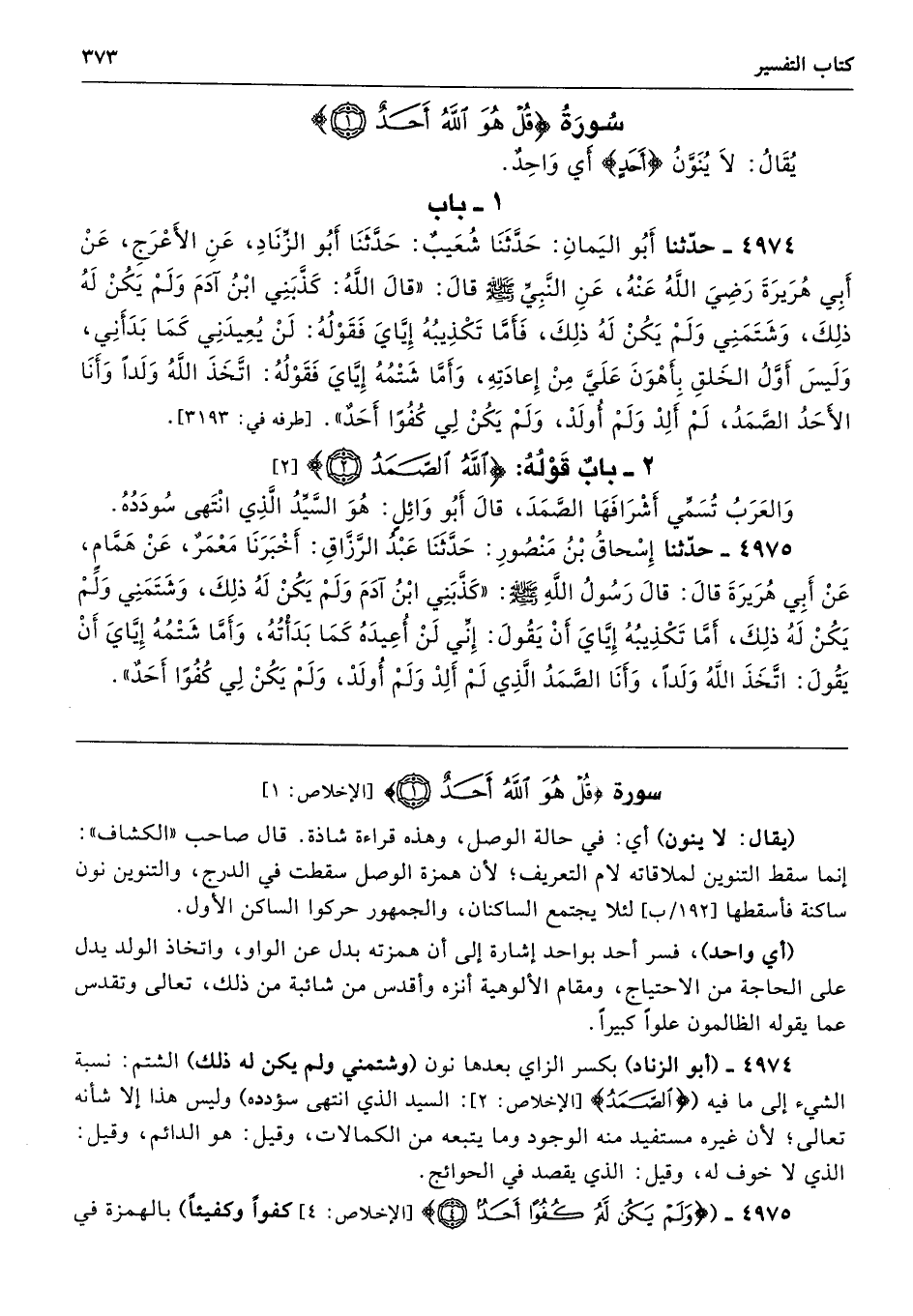 4975 - حَدَّثَنَا إِسْحَاقُ بْنُ مَنْصُورٍ قَالَ وَحَدَّثَنَا عَبْدُ الرَّزَّاقِ أَخْبَرَنَا مَعْمَرٌ عَنْ هَمَّامٍ عَنْ أَبِى هُرَيْرَةَ قَالَ قَالَ رَسُولُ اللَّهِ - صلى الله عليه وسلم - «قَالَ اللَّهُ كَذَّبَنِى ابْنُ آدَمَ وَلَمْ يَكُنْ لَهُ ذَلِكَ، وَشَتَمَنِى وَلَمْ يَكُنْ لَهُ ذَلِكَ، أَمَّا تَكْذِيبُهُ إِيَّاىَ أَنْ يَقُولَ إِنِّى لَنْ أُعِيدَهُ كَمَا بَدَأْتُهُ، وَأَمَّا شَتْمُهُ إِيَّاىَ أَنْ يَقُولَ اتَّخَذَ اللَّهُ وَلَدًا، وَأَنَا الصَّمَدُ الَّذِى لَمْ أَلِدْ وَلَمْ أُولَدْ وَلَمْ يَكُنْ لِى كُفُؤًا أَحَدٌ». (لَمْ يَلِدْ وَلَمْ يُولَدْ * وَلَمْ يَكُنْ لَهُ كُفُؤًا أَحَدٌ) كُفُؤًا وَكَفِيئًا وَكِفَاءً وَاحِدٌ.