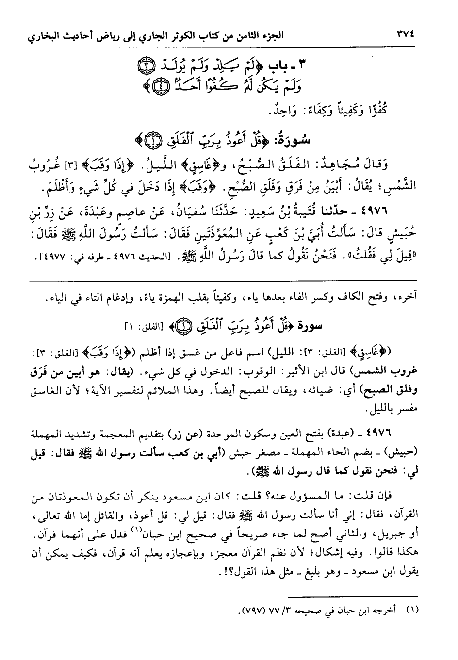 4976 - (عبدة) بفتح العين وسكون الموحدة (عن زر) بتقديم المعجمة وتشديد المهملة (حبيش) -بضم الحاء المهملة- مصغر حبش (أبي بن كعب سألت رسول الله - صلى الله عليه وسلم - فقال: قيل لي: فنحن نقول كما قال رسول الله - صلى الله عليه وسلم -).