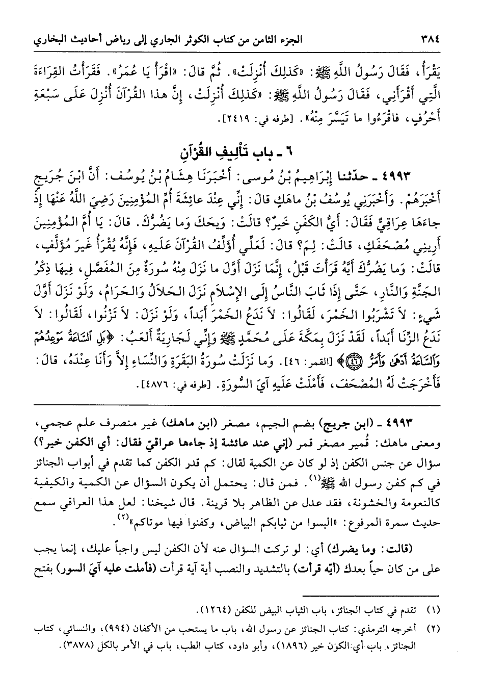 4993 - حَدَّثَنَا إِبْرَاهِيمُ بْنُ مُوسَى أَخْبَرَنَا هِشَامُ بْنُ يُوسُفَ أَنَّ ابْنَ جُرَيْجٍ أَخْبَرَهُمْ قَالَ وَأَخْبَرَنِى يُوسُفُ بْنُ مَاهَكَ قَالَ إِنِّى عِنْدَ عَائِشَةَ أُمِّ الْمُؤْمِنِينَ - رضى الله عنها - إِذْ جَاءَهَا عِرَاقِىٌّ فَقَالَ أَىُّ الْكَفَنِ خَيْرٌ قَالَتْ وَيْحَكَ وَمَا يَضُرُّكَ قَالَ يَا أُمَّ الْمُؤْمِنِينَ أَرِينِى مُصْحَفَكِ. قَالَتْ لِمَ قَالَ لَعَلِّى أُوَلِّفُ الْقُرْآنَ عَلَيْهِ فَإِنَّهُ يُقْرَأُ غَيْرَ مُؤَلَّفٍ. قَالَتْ وَمَا يَضُرُّكَ أَيَّهُ قَرَأْتَ قَبْلُ، إِنَّمَا نَزَلَ أَوَّلَ مَا نَزَلَ مِنْهُ سُورَةٌ مِنَ الْمُفَصَّلِ فِيهَا ذِكْرُ الْجَنَّةِ وَالنَّارِ حَتَّى إِذَا ثَابَ النَّاسُ إِلَى الإِسْلاَمِ نَزَلَ الْحَلاَلُ وَالْحَرَامُ، وَلَوْ نَزَلَ أَوَّلَ شَىْءٍ لاَ تَشْرَبُوا الْخَمْرَ. لَقَالُوا لاَ نَدَعُ الْخَمْرَ أَبَدًا. وَلَوْ نَزَلَ. لاَ تَزْنُوا. لَقَالُوا لاَ نَدَعُ الزِّنَا أَبَدًا. لَقَدْ نَزَلَ بِمَكَّةَ عَلَى مُحَمَّدٍ - صلى الله عليه وسلم - وَإِنِّى لَجَارِيَةٌ أَلْعَبُ (بَلِ السَّاعَةُ مَوْعِدُهُمْ وَالسَّاعَةُ أَدْهَى وَأَمَرُّ) وَمَا نَزَلَتْ سُورَةُ الْبَقَرَةِ وَالنِّسَاءِ إِلاَّ وَأَنَا عِنْدَهُ. قَالَ فَأَخْرَجَتْ لَهُ الْمُصْحَفَ فَأَمْلَتْ عَلَيْهِ آىَ السُّوَرِ. طرفه 4876