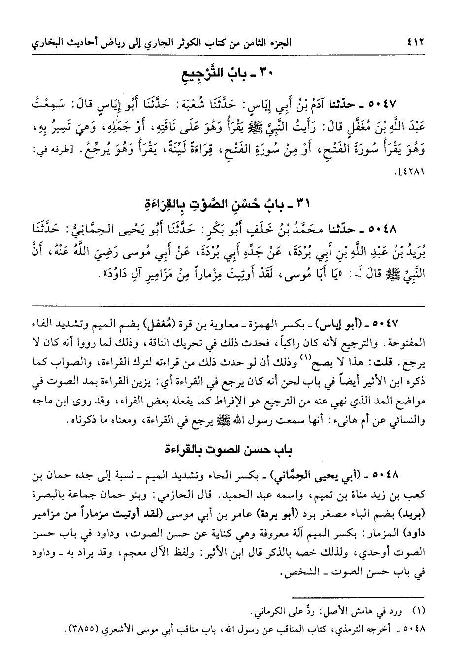 5047 - (أبو إياس) -بكسر الهمزة- معاوية بن قرة (مُغفّل) بضم الميم وتشديد الفاء المفتوحة. والترجيع لأنه كان راكبًا، فحدث ذلك في تحريك الناقة، وذلك لما رووا أنه كان لا يرجع. قلت: هذا لا يصح وذلك أن لو حدث ذلك من قراءته لترك القراءة، والصواب كما ذكره ابن الأثير أيضًا في باب لحن أنه كان يرجع في القراءة أي: يزين القراءة بمد الصوت في مواضع المد الذي نهي عنه من الترجيع هو الإفراط كما يفعله بعض القراء، وقد روى ابن ماجه والنسائي عن أم هانئ: أنها سمعت رسول الله - صلى الله عليه وسلم - يرجع في القراءة، ومعناه ما ذكرناه.