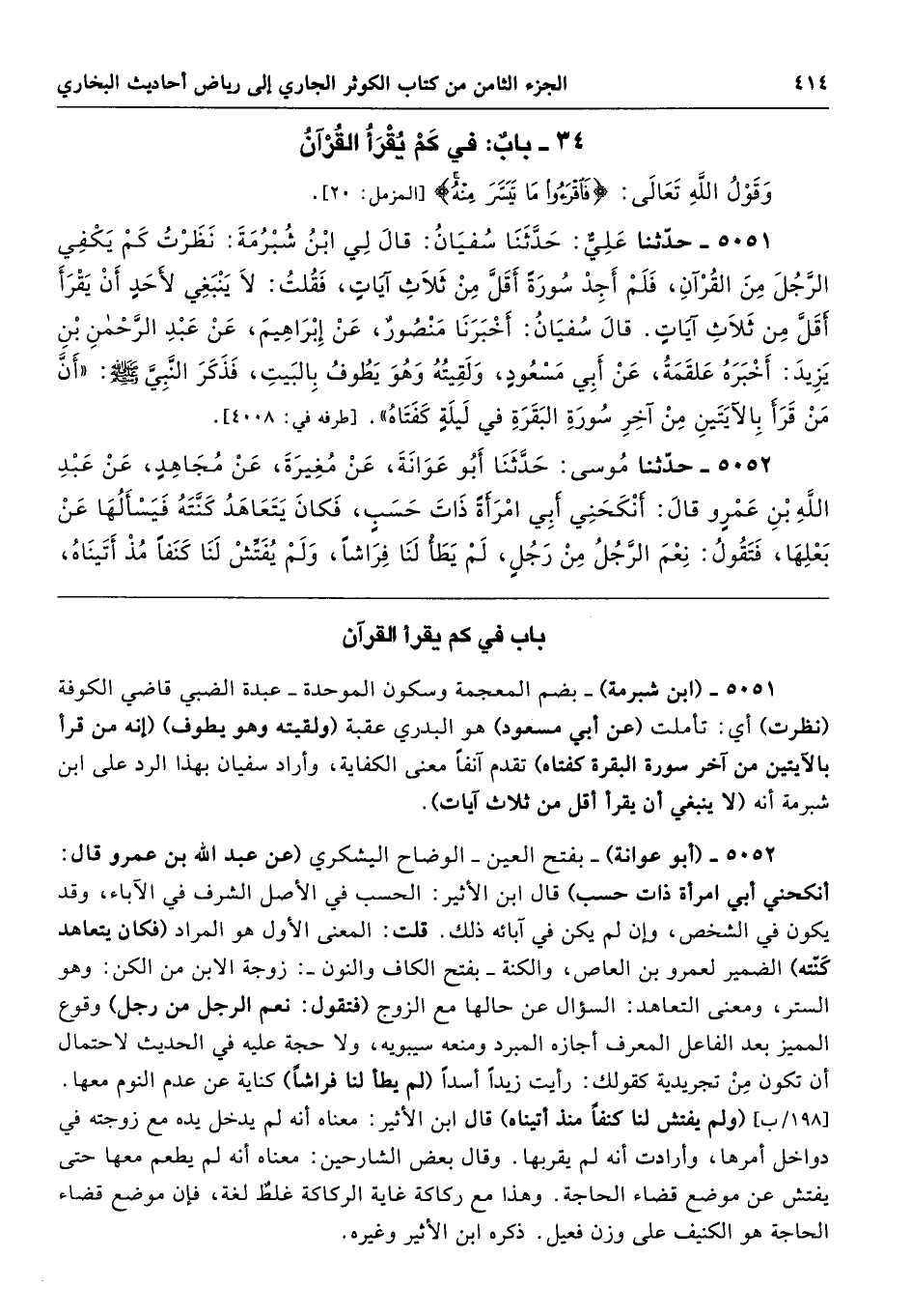 5051 - (ابن شبرمة) -بضم المعجمة وسكون الموحدة- عبدة الضبي قاضي الكوفة (نظرت) أي: تأملت (عن أبي مسعود) هو البدري عقبة (ولقيته وهو يطوف) (أنه من قرأ بالآيتين من آخر سورة البقرة كفتاه) تقدم آنفًا معنى الكفاية، وأراد سفيان بهذا الرد على ابن شبرمة أنه (لا ينبغي أن يقرأ أقل من ثلاث آيات).