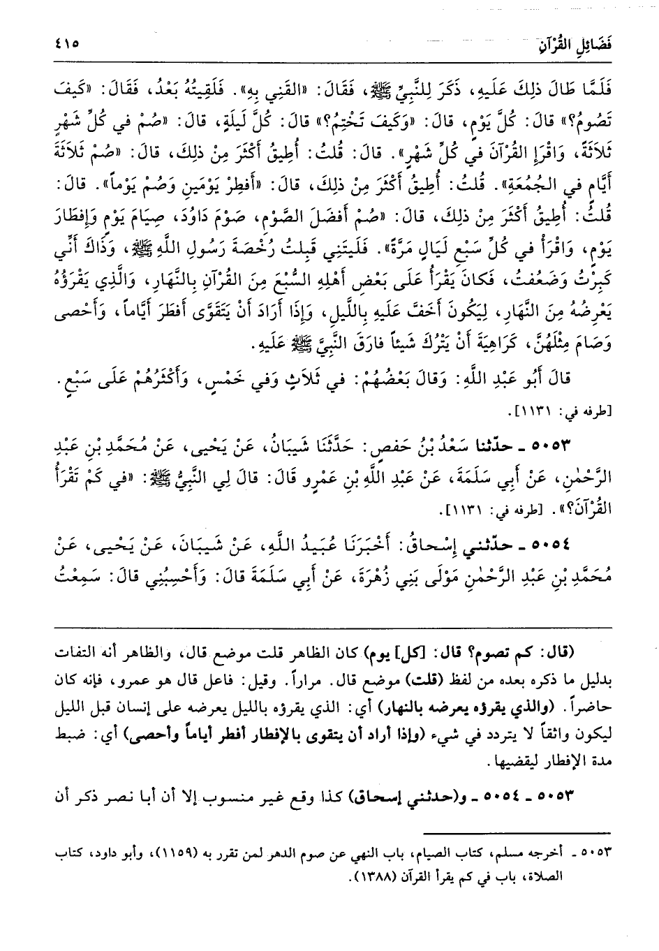 5053 - حَدَّثَنَا سَعْدُ بْنُ حَفْصٍ حَدَّثَنَا شَيْبَانُ عَنْ يَحْيَى عَنْ مُحَمَّدِ بْنِ عَبْدِ الرَّحْمَنِ عَنْ أَبِى سَلَمَةَ عَنْ عَبْدِ اللَّهِ بْنِ عَمْرٍو قَالَ لِى النَّبِىُّ - صلى الله عليه وسلم - «فِي كَمْ تَقْرَأُ الْقُرْآنَ». طرفه 1131