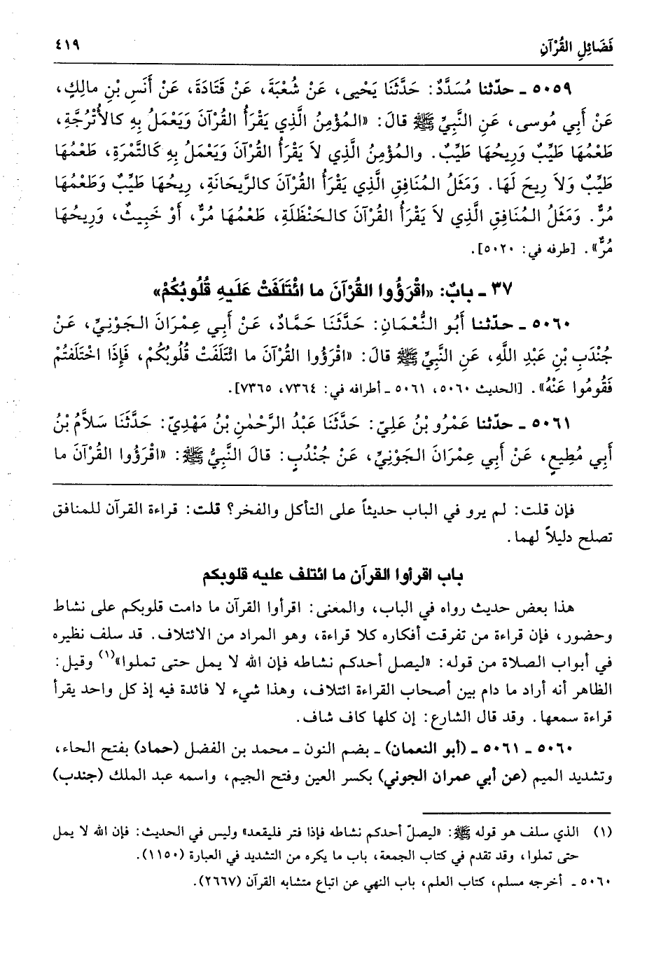 5060 - حَدَّثَنَا أَبُو النُّعْمَانِ حَدَّثَنَا حَمَّادٌ عَنْ أَبِى عِمْرَانَ الْجَوْنِىِّ عَنْ جُنْدَبِ بْنِ عَبْدِ اللَّهِ عَنِ النَّبِيِّ - صلى الله عليه وسلم - قَالَ «اقْرَءُوا الْقُرْآنَ مَا ائْتَلَفَتْ قُلُوبُكُمْ، فَإِذَا اخْتَلَفْتُمْ فَقُومُوا عَنْهُ». طرفاه 7364، 7365