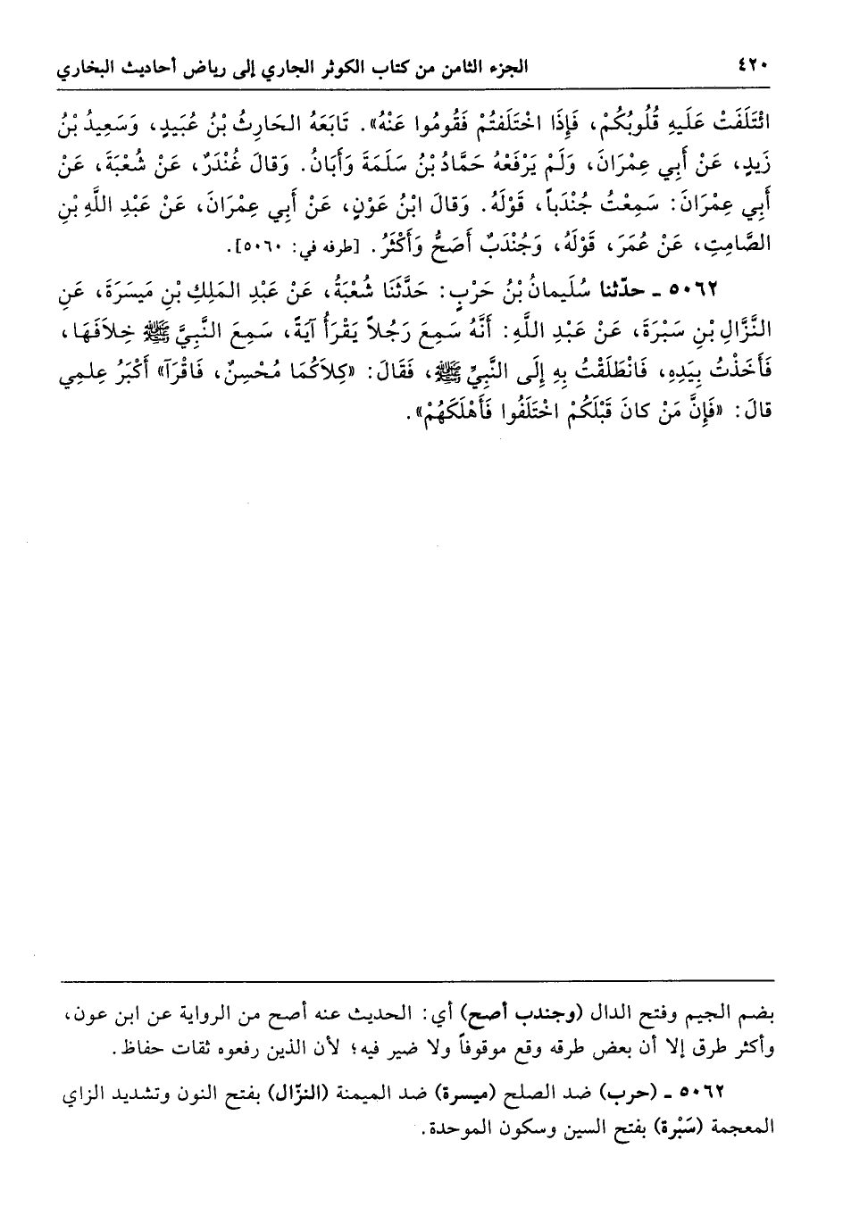 5062 - حَدَّثَنَا سُلَيْمَانُ بْنُ حَرْبٍ حَدَّثَنَا شُعْبَةُ عَنْ عَبْدِ الْمَلِكِ بْنِ مَيْسَرَةَ عَنِ النَّزَّالِ بْنِ سَبْرَةَ عَنْ عَبْدِ اللَّهِ أَنَّهُ سَمِعَ رَجُلاً يَقْرَأُ آيَةً، سَمِعَ النَّبِىَّ - صلى الله عليه وسلم - خِلاَفَهَا، فَأَخَذْتُ بِيَدِهِ فَانْطَلَقْتُ بِهِ إِلَى النَّبِيِّ - صلى الله عليه وسلم - فَقَالَ «كِلاَكُمَا مُحْسِنٌ فَاقْرَآ - أَكْبَرُ عِلْمِى قَالَ - فَإِنَّ مَنْ كَانَ قَبْلَكُمُ اخْتَلَفُوا فَأَهْلَكَهُمْ».