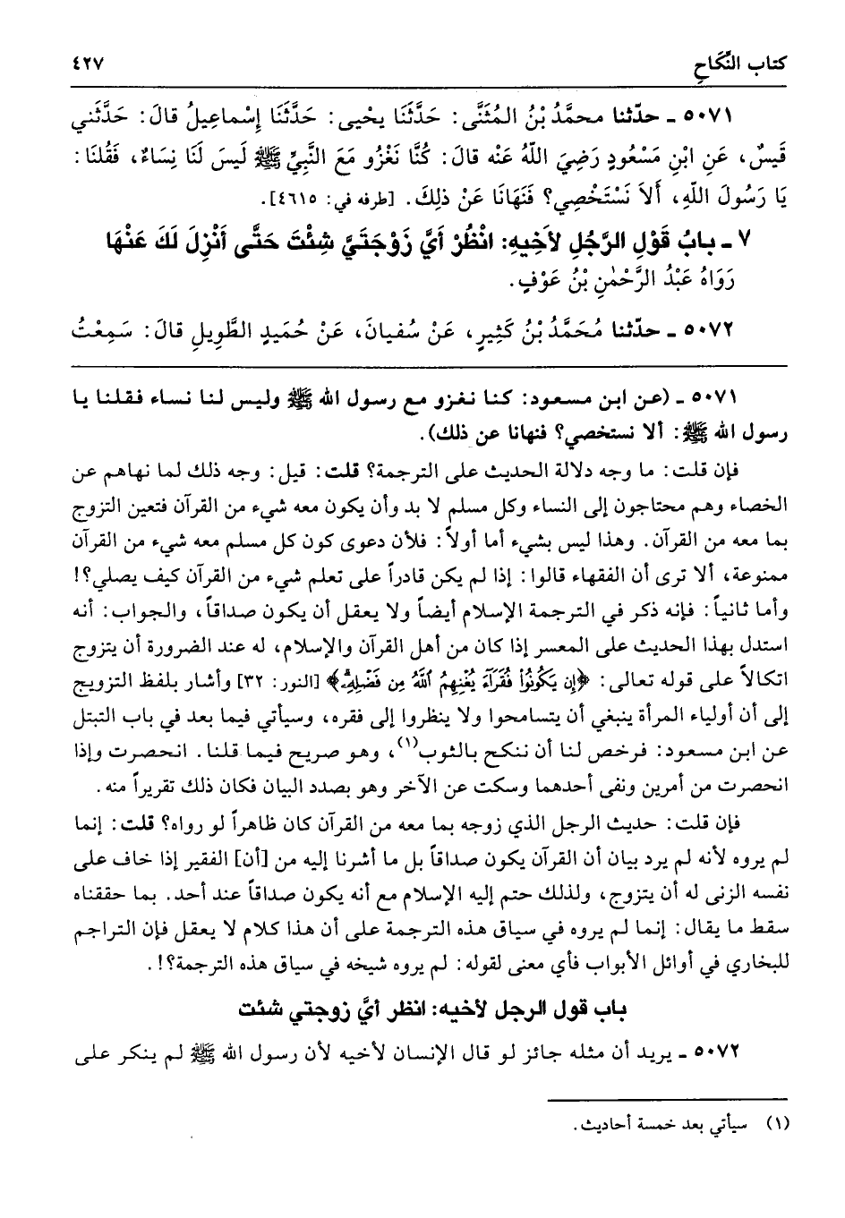 فإن قلت: حديث الرجل الذي زوجه بما معه من القرآن كان ظاهرًا لو رواه؟ قلت: إنما لم يروه لأنه لم يرد بيان أن القرآن يكون صداقًا بل ما أشرنا إليه من [أن] الفقير إذا خاف على نفسه الزنى له أن يتزوج، ولذلك حتم إليه الإسلام مع أنه يكون صداقًا عند أحد. بما حققناه سقط ما يقال: إنما لم يروه في سياق هذه الترجمة على أن هذا كلام لا يعقل فإن الترجمة؟