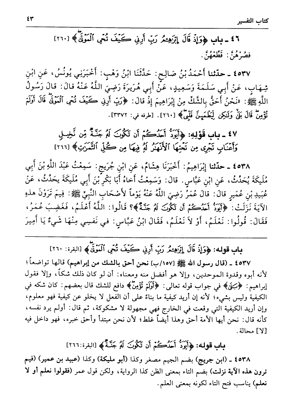 4537 - (قال رسول الله - صلى الله عليه وسلم - نحن أحق بالشك من إبراهيم) قالها تواضعًا؛ لأنه أبوه وقدوة الموحدين، وإلا هو أفضل منه ومعناه: أن لو كان ذلك شكًّا، وإلا فقول إبراهيم: {بَلَى} في جواب قوله تعالى: {أَوَلَمْ تُؤْمِنْ} دافع للشك قال بعضهم: كان شكه في الكيفية وليس بشيء؛ لأنه إن أريد كيفية ما بناءً على أن الفعل لا يخلو عن كيفية فهو معلوم، وإن أريد الكيفية التي وقعت في الخارج فهي مجهولة لا مشكوكة، ثم قال: أو لم يرد نفسه، كأنه قال: نحن أيها الأمة أحق وهذا أيضًا غلط؛ لأن نحن مبتدأ وأحق خبره، فهو داخل فيه [لا] محالة.