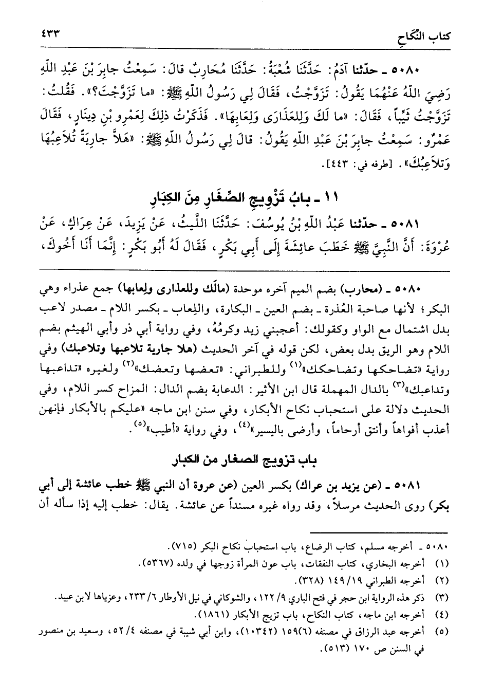 5080 - (محارب) بضم الميم آخره موحدة (ما لَك وللعذارى ولِعابها) جمع عذراء وهي البكر؛ لأنها صاحبة العُذرة -بضم العين- البكارة، واللِعاب -بكسر اللام- مصدر لاعب بدل اشتمال مع الواو وكقولك: أعجبني زيد وكرمُهُ، وفي رواية أبي ذر وأبي الهيثم بضم اللام وهو الريق بدل بعض، لكن قوله في آخر الحديث (هلا جارية تلاعبها وتلاعبك) وفي رواية "تضاحكها وتضاحكك" وللطبراني: "تعضها وتعضك" ولغيره "تداعبها وتداعبك" بالدال المهملة قال ابن الأثير: الدعابة بضم الدال: المزاح كسر اللام، وفي الحديث دلالة على استحباب نكاح الأبكار، وفي سنن ابن ماجه "عليكم بالأبكار فإنهن أعذب أفواهًا وأنتق أرحامًا، وأرضى باليسير"، وفي رواية "أطيب".