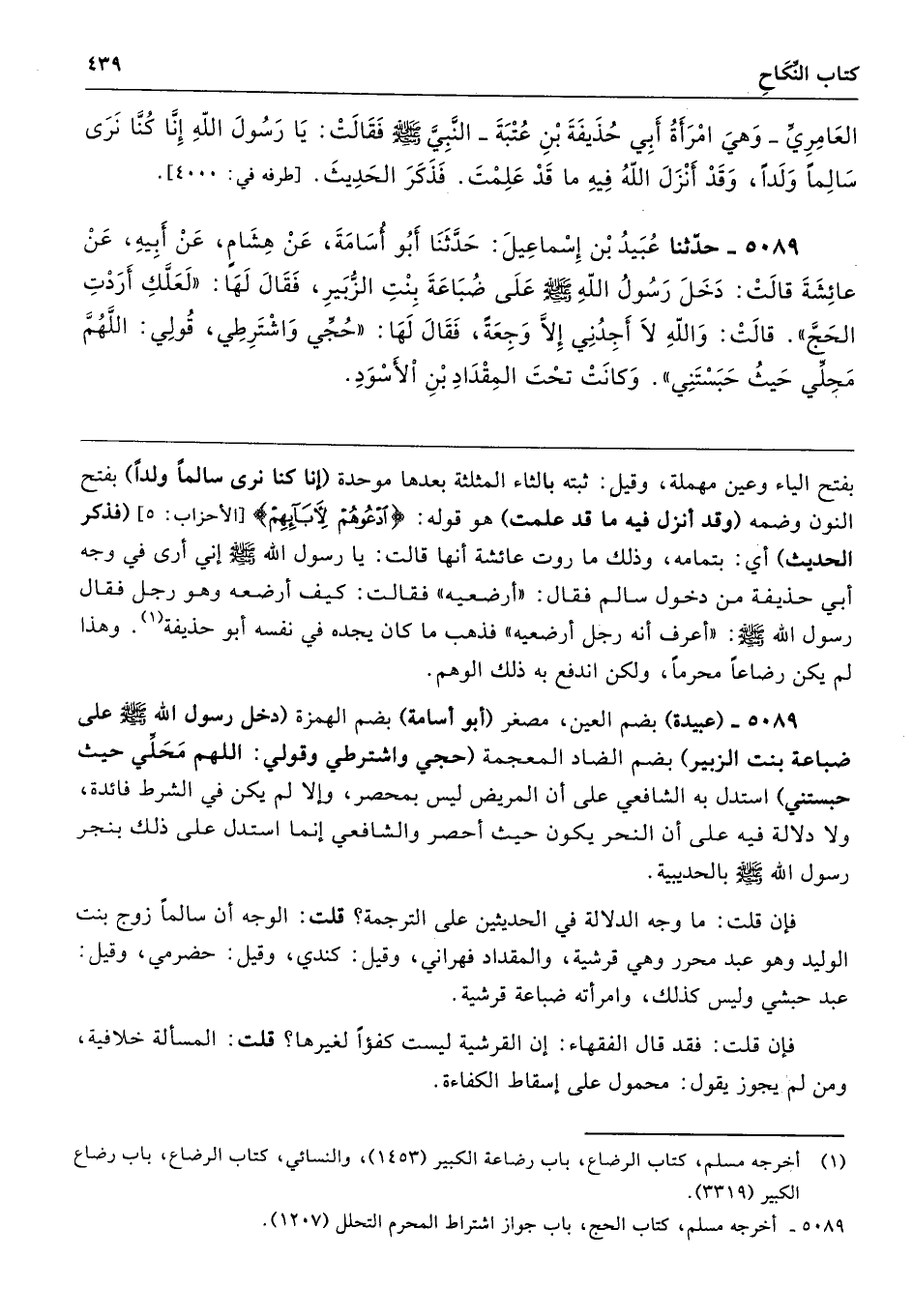 5089 (عبيدة) بضم العين، مصغر (أبو أسامة) بضم الهمزة (دخل رسول الله - صلى الله عليه وسلم - على ضباعة بنت الزبير) بضم الضاد المعجمة (حجي واشترطي وقولي: اللهم مَحَلِّي حيث حبستني) استدل به الشافعي على أن المريض ليس بمحصر، وإلا لم يكن في الشرط فائدة، ولا دلالة فيه على أن النحر يكون حيث أحصر والشافعي إنما استدل على ذلك بنحر رسول الله - صلى الله عليه وسلم - بالحديبية.