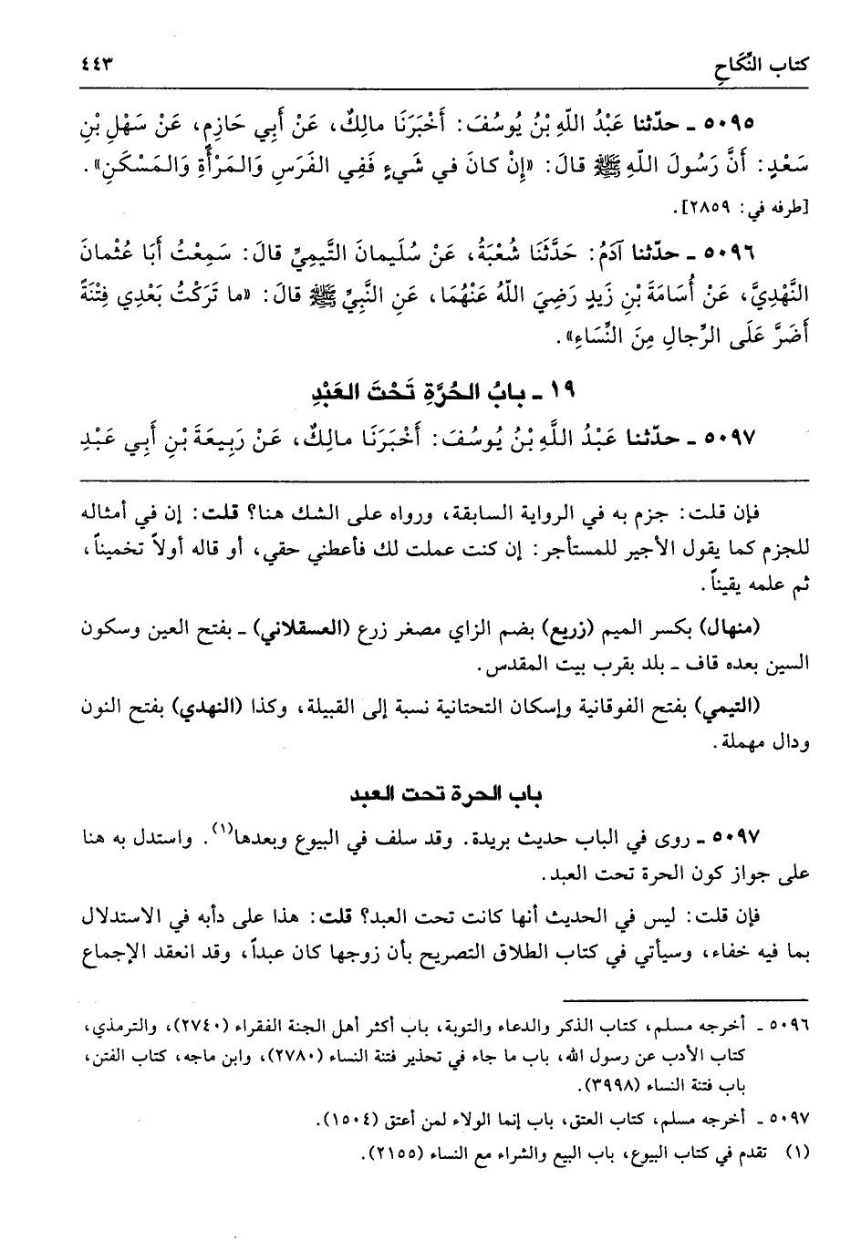 5096 - حَدَّثَنَا آدَمُ حَدَّثَنَا شُعْبَةُ عَنْ سُلَيْمَانَ التَّيْمِىِّ قَالَ سَمِعْتُ أَبَا عُثْمَانَ النَّهْدِىَّ عَنْ أُسَامَةَ بْنِ زَيْدٍ - رضى الله عنهما - عَنِ النَّبِيِّ - صلى الله عليه وسلم - قَالَ «مَا تَرَكْتُ بَعْدِى فِتْنَةً أَضَرَّ عَلَى الرِّجَالِ مِنَ النِّسَاءِ».