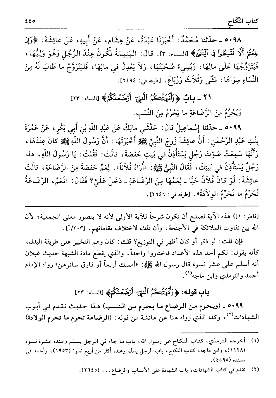 5099 - (ويحرم من الرضاع ما يحرم من النسب) هذا حديث تقدم في أبوب الشهادات، وكذا الذي رواه هنا عن عائشة من قوله: (الرضاعة تحرم ما تحرم الولادة)