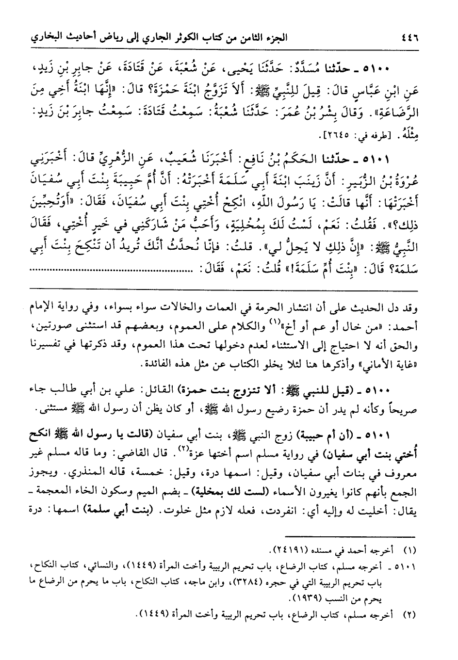 5100 - (قيل للنبي - صلى الله عليه وسلم -: ألا تتزوج بنت حمزة) القائل: علي بن أبي طالب جاء صريحًا وكأنه لم يدر أن حمزة رضيع رسول الله - صلى الله عليه وسلم -، أو كان يظن أن رسول الله - صلى الله عليه وسلم - مستثنى.