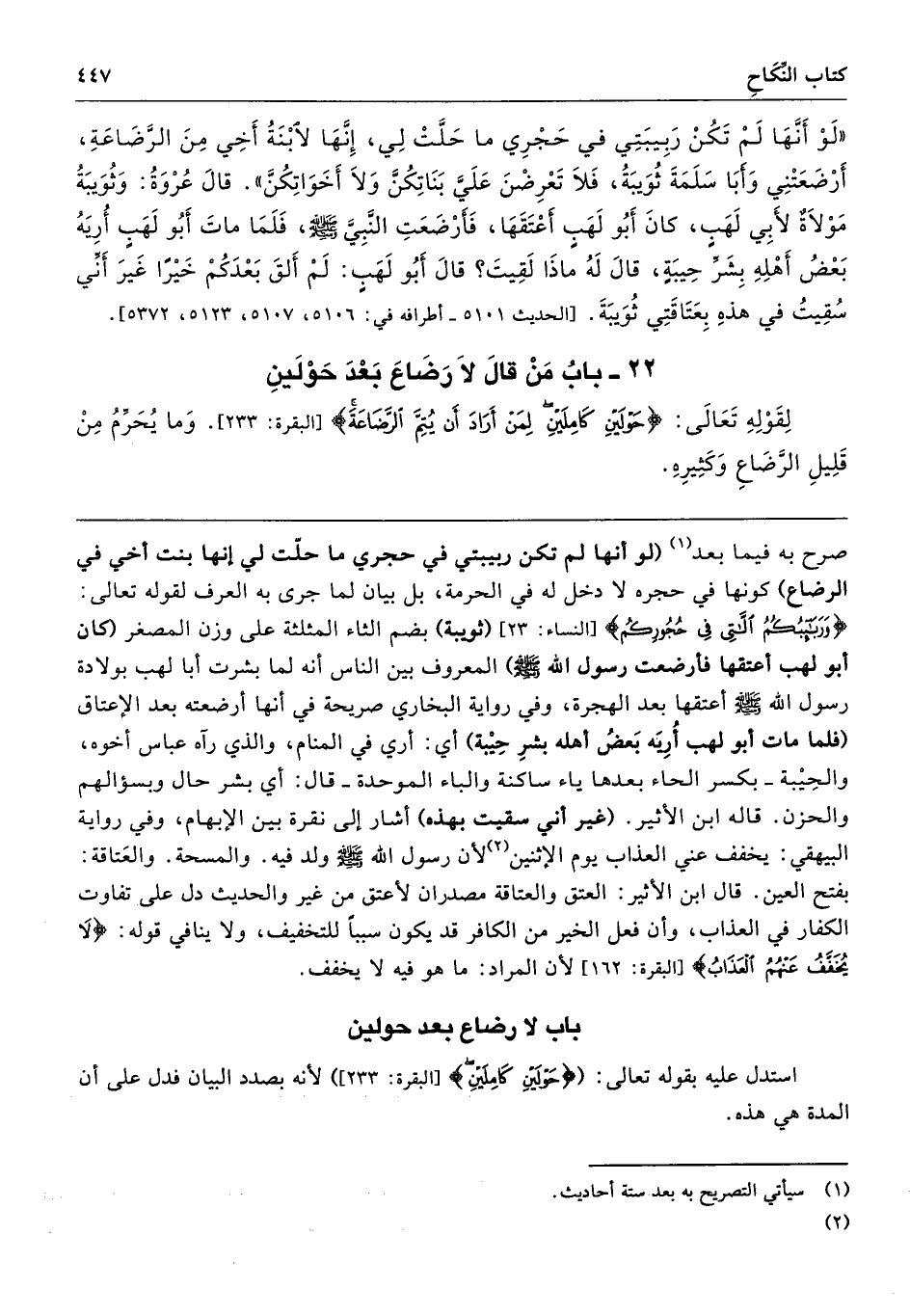لِقَوْلِهِ تَعَالَى (حَوْلَيْنِ كَامِلَيْنِ لِمَنْ أَرَادَ أَنْ يُتِمَّ الرَّضَاعَةَ). وَمَا يُحَرِّمُ مِنْ قَلِيلِ الرَّضَاعِ وَكَثِيرِهِ.