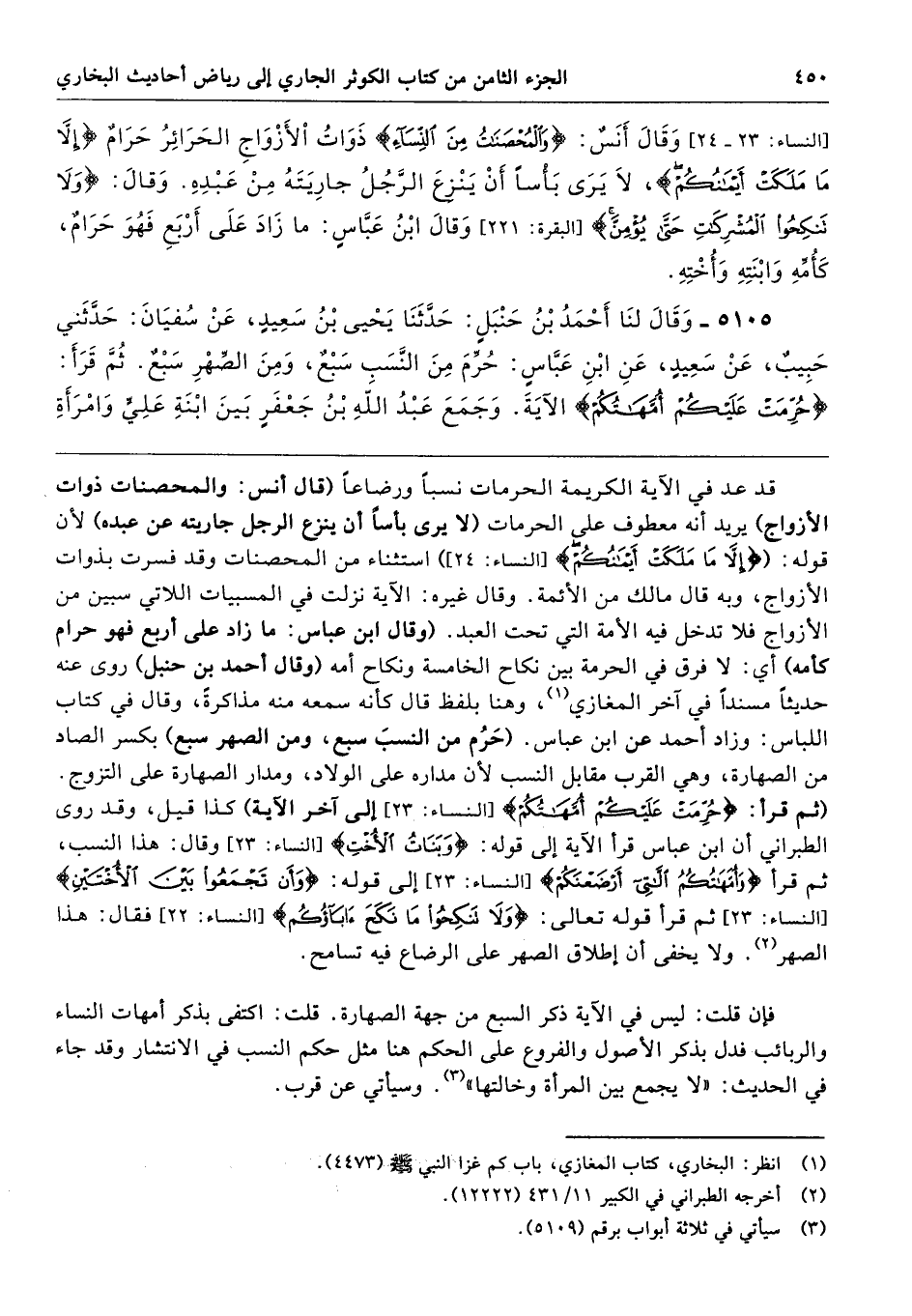 قد عد في الآية الكريمة الحرمات نسبًا ورضاعًا (قال أنس: والمحصنات ذوات الأزواج) يريد أنه معطوف علي الحرمات (لا يرى بأسًا أن ينزع الرجل جاريته عن عبده) لأن قوله: ({إِلَّا مَا مَلَكَتْ أَيْمَانُكُمْ} [النساء: 24]) استثناء من المحصنات وقد فسرت بذوات الأزواج، وبه قال مالك من الأئمة. وقال غيره: الآية نزلت في المسبيات اللاتي سبين من الأزواج فلا تدخل فيه الأمة التي تحت العبد. (وقال ابن عباس: ما زاد على أربع فهو حرام كأمه) أي: لا فرق في الحرمة بين نكاح الخامسة ونكاح أمه (وقال أحمد بن حنبل) روى عنه حديثًا مسندًا في آخر المغازي، وهنا بلفظ قال كأنه سمعه منه مذاكرةً، وقال في كتاب اللباس: وزاد أحمد عن ابن عباس. (حَرُم من النسبِ سبع، ومن الصهر سبع) بكسر الصاد من الصهارة، وهي القرب مقابل النسب لأن مداره على الولاد، ومدار الصهارة على التزوج. (ثم قرأ: {حُرِّمَتْ عَلَيْكُمْ أُمَّهَاتُكُمْ} [النساء: 23] إلى آخر الآية) كذا قيل، وقد روى الطبراني أن ابن عباس قرأ الآية إلى قوله: {وَبَنَاتُ الْأُخْتِ} [النساء: 23] وقال: هذا النسب، ثم قرأ {وَأُمَّهَاتُكُمُ اللَّاتِي أَرْضَعْنَكُمْ} [النساء: 23] إلى قوله: {وَأَنْ تَجْمَعُوا بَيْنَ الْأُخْتَيْنِ} [النساء: 23] ثم قرأ قوله تعالى: {وَلَا تَنْكِحُوا مَا نَكَحَ آبَاؤُكُمْ} [النساء: 22] فقال: هذا الصهر. ولا يخفى أن إطلاق الصهر على الرضاع فيه تسامح.
