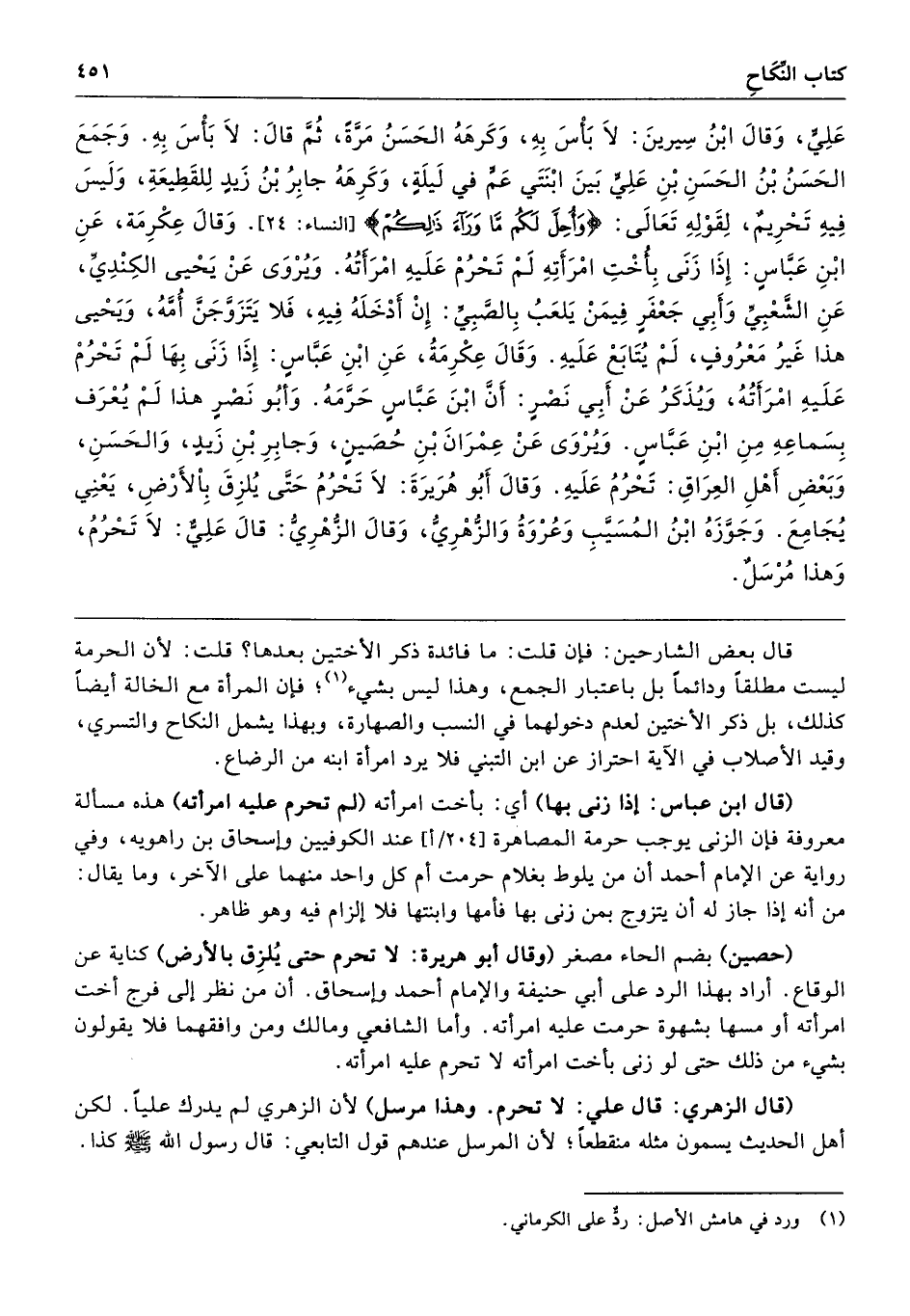عَلِىٍّ. وَقَالَ ابْنُ سِيرِينَ لاَ بَأْسَ بِهِ. وَكَرِهَهُ الْحَسَنُ مَرَّةً ثُمَّ قَالَ لاَ بَأْسَ بِهِ. وَجَمَعَ الْحَسَنُ بْنُ الْحَسَنِ بْنِ عَلِىٍّ بَيْنَ ابْنَتَىْ عَمٍّ فِي لَيْلَةٍ، وَكَرِهَهُ جَابِرُ بْنُ زَيْدٍ لِلْقَطِيعَةِ، وَلَيْسَ فِيهِ تَحْرِيمٌ لِقَوْلِهِ تَعَالَى (وَأُحِلَّ لَكُمْ مَا وَرَاءَ ذَلِكُمْ) وَقَالَ عِكْرِمَةُ عَنِ ابْنِ عَبَّاسٍ إِذَا زَنَى بِأُخْتِ امْرَأَتِهِ لَمْ تَحْرُمْ عَلَيْهِ امْرَأَتُهُ. وَيُرْوَى عَنْ يَحْيَى الْكِنْدِىِّ عَنِ الشَّعْبِىِّ وَأَبِى جَعْفَرٍ، فِيمَنْ يَلْعَبُ بِالصَّبِىِّ إِنْ أَدْخَلَهُ فِيهِ، فَلاَ يَتَزَوَّجَنَّ أُمَّهُ، وَيَحْيَى هَذَا غَيْرُ مَعْرُوفٍ، لَمْ يُتَابَعْ عَلَيْهِ. وَقَالَ عِكْرِمَةُ عَنِ ابْنِ عَبَّاسٍ إِذَا زَنَى بِهَا لَمْ تَحْرُمْ عَلَيْهِ امْرَأَتُهُ. وَيُذْكَرُ عَنْ أَبِى نَصْرٍ أَنَّ ابْنَ عَبَّاسٍ حَرَّمَهُ. وَأَبُو نَصْرٍ هَذَا لَمْ يُعْرَفْ بِسَمَاعِهِ مِنِ ابْنِ عَبَّاسٍ. وَيُرْوَى عَنْ عِمْرَانَ بْنِ حُصَيْنٍ وَجَابِرِ بْنِ زَيْدٍ وَالْحَسَنِ وَبَعْضِ أَهْلِ الْعِرَاقِ تَحْرُمُ عَلَيْهِ. وَقَالَ أَبُو هُرَيْرَةَ لاَ تَحْرُمُ حَتَّى يُلْزِقَ بِالأَرْضِ يَعْنِى يُجَامِعَ. وَجَوَّزَهُ ابْنُ الْمُسَيَّبِ وَعُرْوَةُ وَالزُّهْرِىُّ. وَقَالَ الزُّهْرِىُّ قَالَ عَلِىٌّ لاَ تَحْرُمُ. وَهَذَا مُرْسَلٌ.