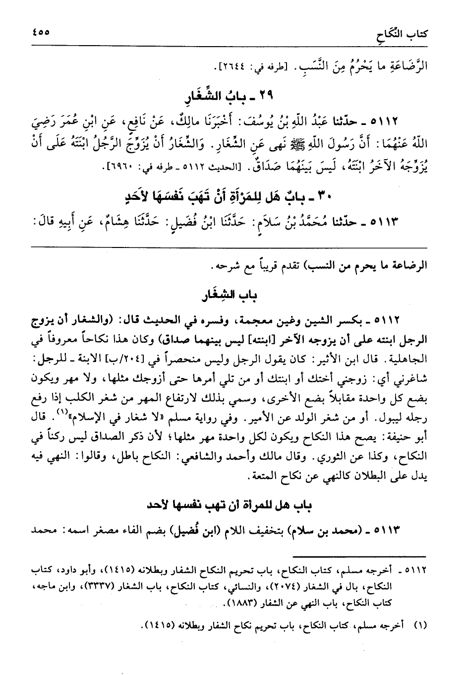 5112 - حَدَّثَنَا عَبْدُ اللَّهِ بْنُ يُوسُفَ أَخْبَرَنَا مَالِكٌ عَنْ نَافِعٍ عَنِ ابْنِ عُمَرَ - رضى الله عنهما - أَنَّ رَسُولَ اللَّهِ - صلى الله عليه وسلم - نَهَى عَنِ الشِّغَارِ، وَالشِّغَارُ أَنْ يُزَوِّجَ الرَّجُلُ ابْنَتَهُ عَلَى أَنْ يُزَوِّجَهُ الآخَرُ ابْنَتَهُ، لَيْسَ بَيْنَهُمَا صَدَاقٌ. طرفه 6960