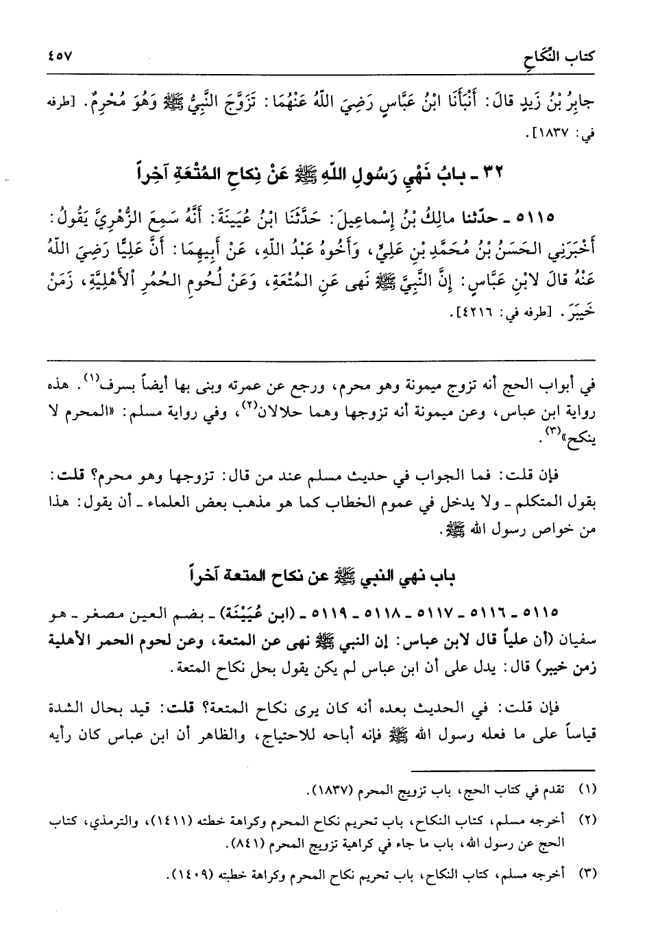 5115 - 5116 - 5117 - 5118 - 5119 - (ابن عُيَيْنَة) -بضم العين مصغر- هو سفيان (أن عليًّا قال لابن عباس: إن النبي - صلى الله عليه وسلم - نهى عن المتعة، وعن لحوم الحمر الأهلية زمن خيبر) قال: يدل على أن ابن عباس لم يكن يقول بحل نكاح المتعة.
