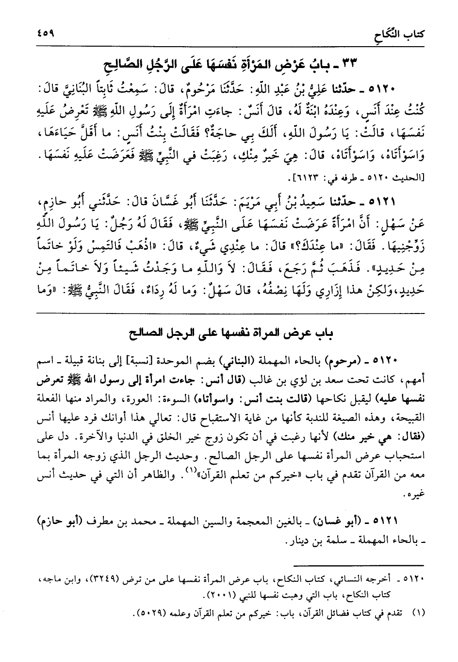5120 - حَدَّثَنَا عَلِىُّ بْنُ عَبْدِ اللَّهِ حَدَّثَنَا مَرْحُومٌ قَالَ سَمِعْتُ ثَابِتًا الْبُنَانِىَّ قَالَ كُنْتُ عِنْدَ أَنَسٍ وَعِنْدَهُ ابْنَةٌ لَهُ، قَالَ أَنَسٌ جَاءَتِ امْرَأَةٌ إِلَى رَسُولِ اللَّهِ - صلى الله عليه وسلم - تَعْرِضُ عَلَيْهِ نَفْسَهَا قَالَتْ يَا رَسُولَ اللَّهِ أَلَكَ بِى حَاجَةٌ، فَقَالَتْ بِنْتُ أَنَسٍ مَا أَقَلَّ حَيَاءَهَا وَاسَوْأَتَاهْ وَاسَوْأَتَاهْ. قَالَ هِىَ خَيْرٌ مِنْكِ رَغِبَتْ فِي النَّبِيِّ - صلى الله عليه وسلم - فَعَرَضَتْ عَلَيْهِ نَفْسَهَا. طرفه 6123