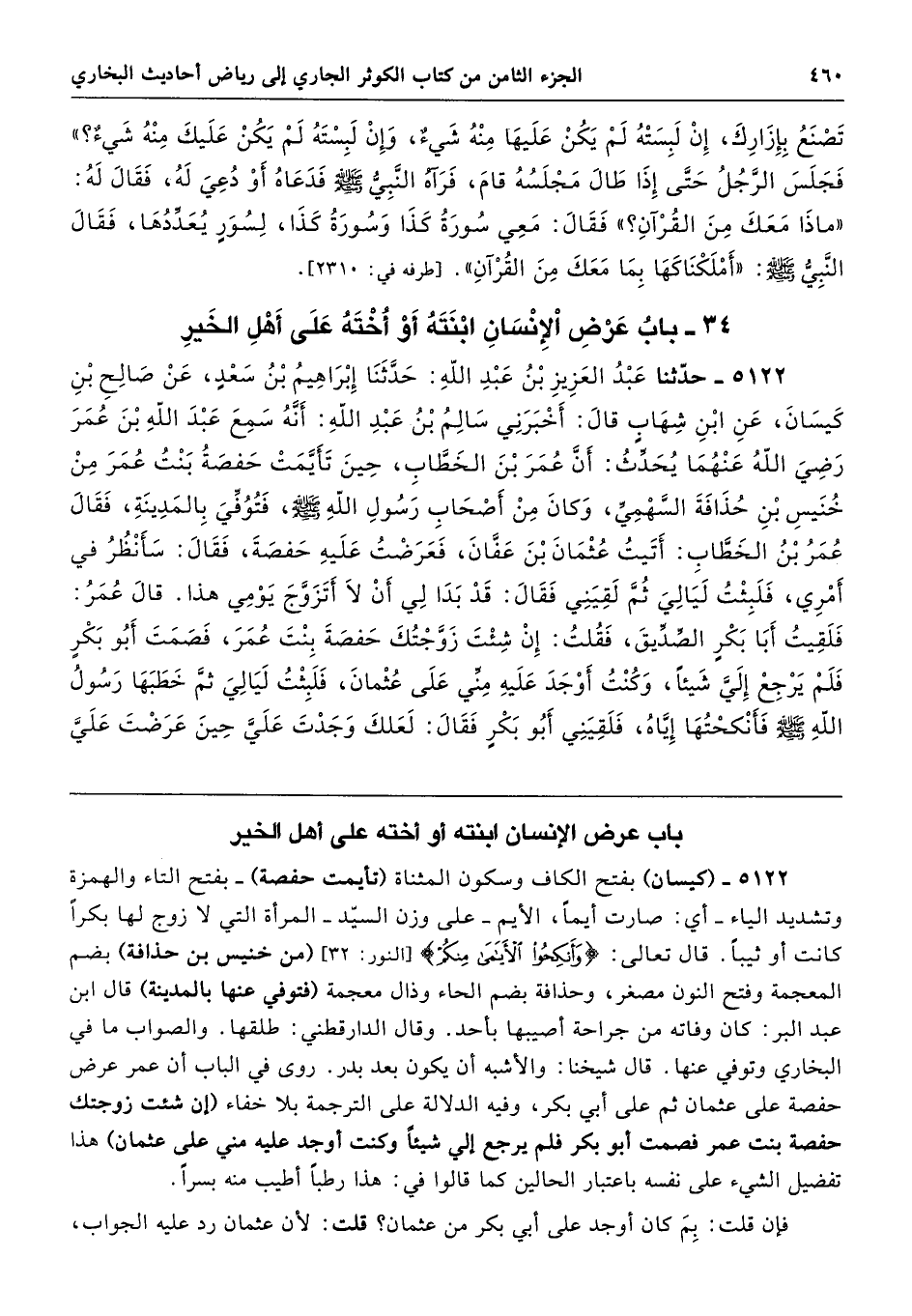 5122 - (كيسان) بفتح الكاف وسكون المثناة (تأيمت حفصة) -بفتح التاء والهمزة وتشديد الياء- أي: صارت أيمًا، الأيم -على وزن السيد- المرأة التي لا زوج لها بكرًا كانت أو ثيبًا. قال تعالى: {وَأَنْكِحُوا الْأَيَامَى مِنْكُمْ} [النور: 32] (من خنيس بن حذافة) بضم المعجمة وفتح النون مصغر، وحذافة بضم الحاء وذال معجمة (فتوفي عنها بالمدينة) قال ابن عبد البر: كان وفاته من جراحة أصيبها بأحد. وقال الدارقطني: طلقها. والصواب ما في البخاري وتوفي عنها. قال شيخنا: والأشبه أن يكون بعد بدر. روى في الباب أن عمر عرض حفصة على عثمان ثم على أبي بكر، وفيه الدلالة على الترجمة بلا خفاء (إن شئت زوجتك حفصة بنت عمر فصمت أبو بكر فلم يرجع إلي شيئًا وكنت أوجد عليه مني على عثمان) هذا تفضيل الشيء على نفسه باعتبار الحالين كما قالوا في: هذا رطبًا أطيب منه بسرًا.