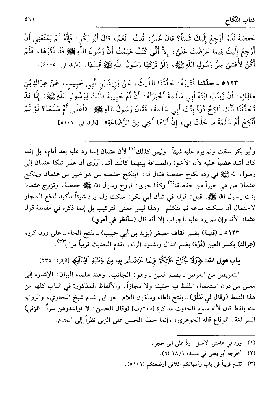 5123 - (قتيبة) بضم القاف مصغر (يزيد بن أبي حبيب) -بفتح الحاء- على وزن كريم (عِراك) بكسر العين (دُرّة) بضم الدال وتشديد الراء. تقدم الحديث قريبًا مرارًا.