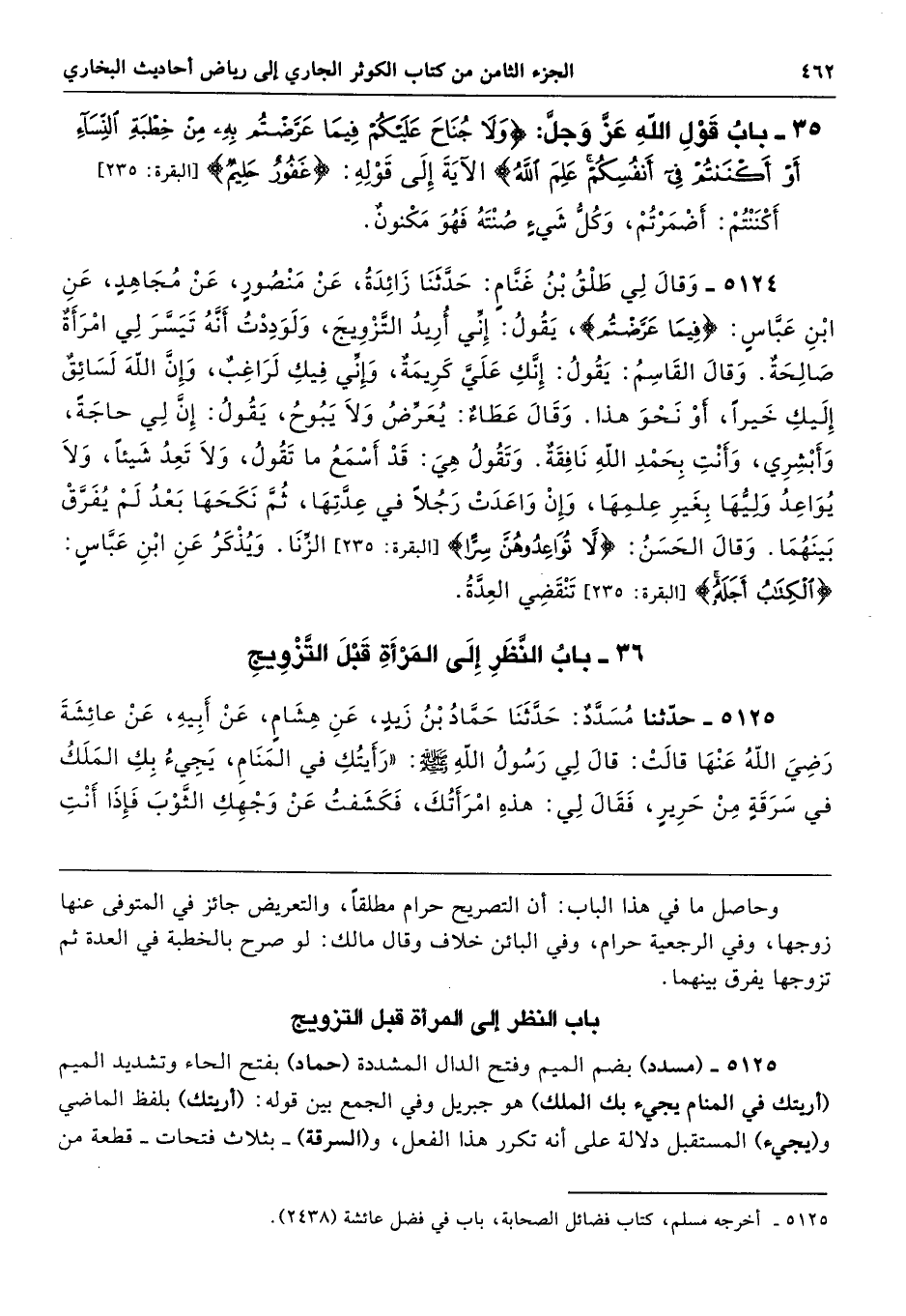 وحاصل ما في هذا الباب: أن التصريح حرام مطلقًا، والتعريض جائز في المتوفى عنها زوجها، وفي الرجعية حرام، وفي البائن خلاف وقال مالك: لو صرح بالخطبة في العدة ثم تزوجها يفرق بينهما.