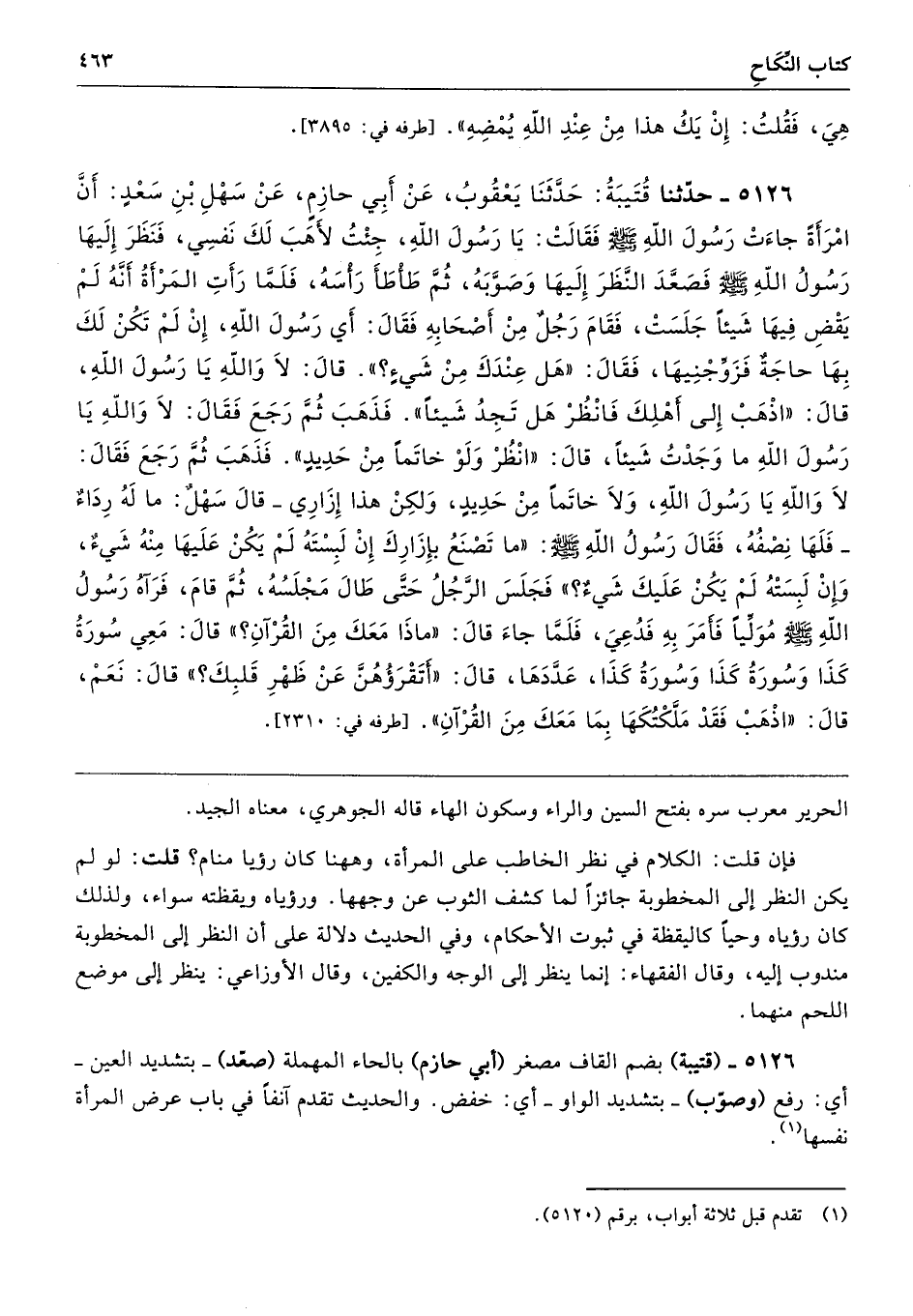 5126 - حَدَّثَنَا قُتَيْبَةُ حَدَّثَنَا يَعْقُوبُ عَنْ أَبِى حَازِمٍ عَنْ سَهْلِ بْنِ سَعْدٍ أَنَّ امْرَأَةً جَاءَتْ رَسُولَ اللَّهِ - صلى الله عليه وسلم - فَقَالَتْ يَا رَسُولَ اللَّهِ جِئْتُ لأَهَبَ لَكَ نَفْسِى. فَنَظَرَ إِلَيْهَا رَسُولُ اللَّهِ - صلى الله عليه وسلم - فَصَعَّدَ النَّظَرَ إِلَيْهَا وَصَوَّبَهُ، ثُمَّ طَأْطَأَ رَأْسَهُ، فَلَمَّا رَأَتِ الْمَرْأَةُ أَنَّهُ لَمْ يَقْضِ فِيهَا شَيْئًا جَلَسَتْ، فَقَامَ رَجُلٌ مِنْ أَصْحَابِهِ فَقَالَ أَىْ رَسُولَ اللَّهِ إِنْ لَمْ تَكُنْ لَكَ بِهَا حَاجَةٌ فَزَوِّجْنِيهَا. فَقَالَ «هَلْ عِنْدَكَ مِنْ شَىْءٍ». قَالَ لاَ وَاللَّهِ يَا رَسُولَ اللَّهِ. قَالَ «اذْهَبْ إِلَى أَهْلِكَ فَانْظُرْ هَلْ تَجِدُ شَيْئًا». فَذَهَبَ ثُمَّ رَجَعَ فَقَالَ لاَ وَاللَّهِ يَا رَسُولَ اللَّهِ مَا وَجَدْتُ شَيْئًا. قَالَ «انْظُرْ وَلَوْ خَاتَمًا مِنْ حَدِيدٍ». فَذَهَبَ ثُمَّ رَجَعَ فَقَالَ لاَ وَاللَّهِ يَا رَسُولَ اللَّهِ وَلاَ خَاتَمًا مِنْ حَدِيدٍ، وَلَكِنْ هَذَا إِزَارِى - قَالَ سَهْلٌ مَا لَهُ رِدَاءٌ - فَلَهَا نِصْفُهُ. فَقَالَ رَسُولُ اللَّهِ - صلى الله عليه وسلم - «مَا تَصْنَعُ بِإِزَارِكَ إِنْ لَبِسْتَهُ لَمْ يَكُنْ عَلَيْهَا مِنْهُ شَىْءٌ، وَإِنْ لَبِسَتْهُ لَمْ يَكُنْ عَلَيْكَ شَىْءٌ». فَجَلَسَ الرَّجُلُ حَتَّى طَالَ مَجْلَسُهُ ثُمَّ قَامَ فَرَآهُ رَسُولُ اللَّهِ - صلى الله عليه وسلم - مُوَلِّيًا فَأَمَرَ بِهِ فَدُعِىَ فَلَمَّا جَاءَ قَالَ «مَاذَا مَعَكَ مِنَ الْقُرْآنِ». قَالَ مَعِى سُورَةَ كَذَا وَسُورَةَ كَذَا وَسُورَةَ كَذَا. عَدَّدَهَا. قَالَ «أَتَقْرَؤُهُنَّ عَنْ ظَهْرِ قَلْبِكَ». قَالَ نَعَمْ. قَالَ «اذْهَبْ فَقَدْ مَلَّكْتُكَهَا بِمَا مَعَكَ مِنَ الْقُرْآنِ». طرفه 2310
