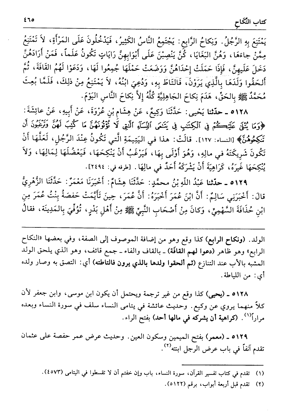 الولد. (ونكاح الرابع) كذا وقع وهو من إضافة الموصوف إلى الصفة، وفي بعضها "النكاح الرابع" وهو ظاهر (دعوا لهم القافَة) -بالقاف والفاء- جمع قائف، وهو الذي يلحق الولد المشبه بالأب عند التنازع (ثم ألحقوا ولدها بالذي يرون فالتاطته) أي: التصق به وصار ولده أي: من اللياطة.