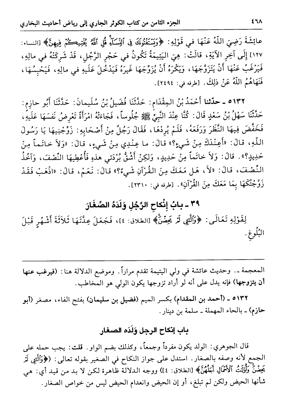 المعجمة-. وحديث عائشة في ولي اليتيمة تقدم مرارًا. وموضع الدلالة هنا: (فيرغب عنها أن يتزوجها) فإنه يدل على أنه لو أراد تزوجها يكون الولي هو المخاطب.