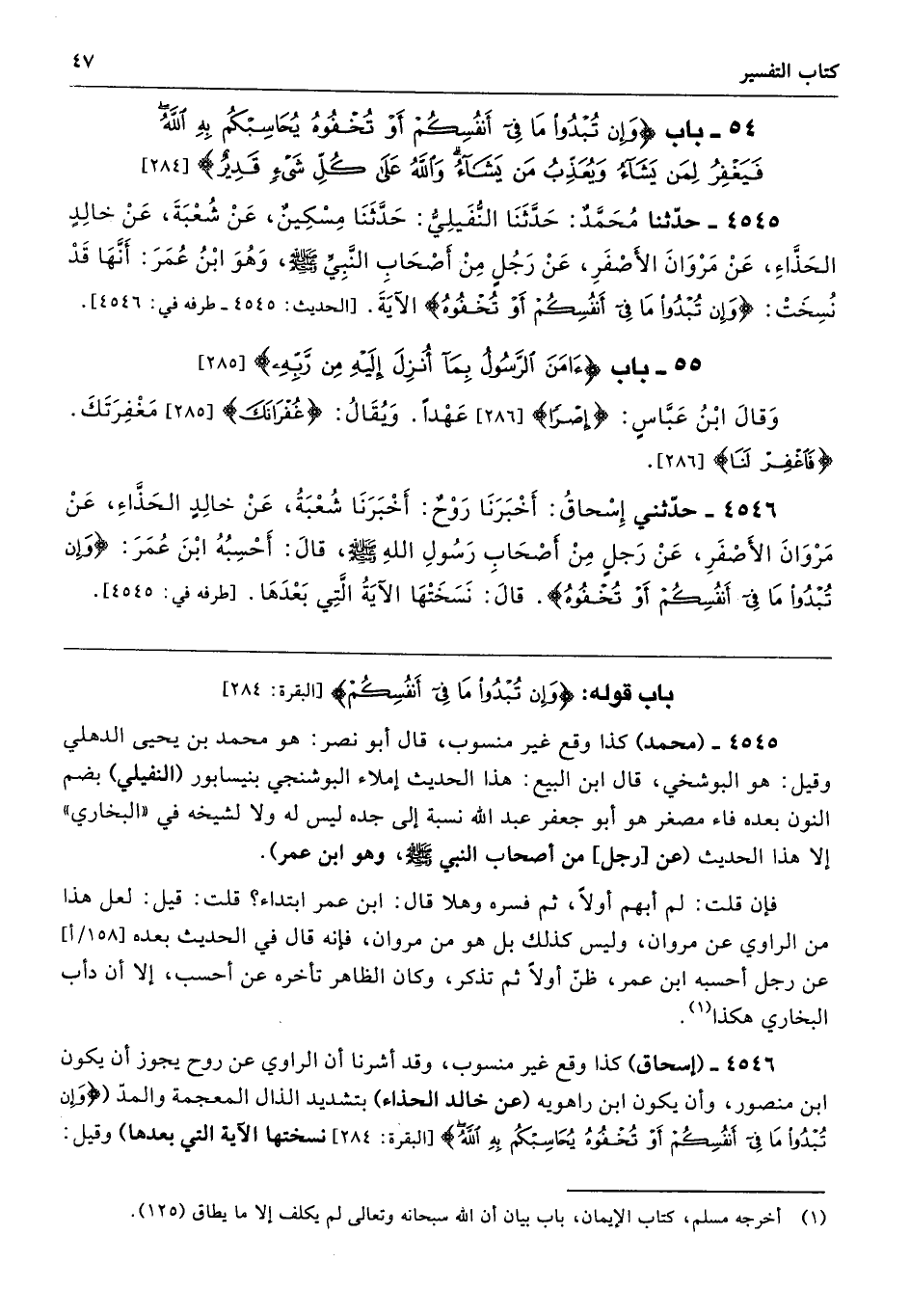 4546 - (إسحاق) كذا وقع غير منسوب، وقد أشرنا أن الراوي عن روح يجوز أن يكون ابن منصور، وأن يكون ابن راهويه (عن خالد الحذاء) بتشديد الذال المعجمة والمدّ ({وَإِنْ تُبْدُوا مَا فِي أَنْفُسِكُمْ أَوْ تُخْفُوهُ يُحَاسِبْكُمْ بِهِ اللَّهُ} [البقرة: 284] نسختها الآية التي بعدها) وقيل: