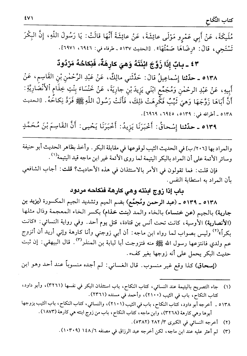 5138 - 5139 - (عبد الرحمن ومُجمِّع) بضم الميم وتشديد الجيم المكسورة (يزيد بن جارية) بالجيم (عن خنساء) بالخاء والمد (بنت خذام) بكسر الخاء المعجمة وذال مثلهما (الأنصارية) الأوسية، كانت تحت أنس بن قتادة، قتل يوم أحد. وفي رواية النسائي: "كانت بكرًا" وليس بصواب لما رواه ابن ماجه: أن أبي زوجني وأنا كارهة وإني أريد أن أتزوج عم ولدي فانتزعها رسول الله - صلى الله عليه وسلم - منه فتزوجت أبا لبابة بن المنذر. قال البيهقي: إن ثبت حديث البكر يحمل على أنه زوجها بغير كفء.