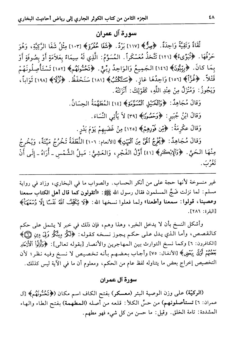 تُقَاةٌ وَتَقِيَّةٌ وَاحِدَةٌ (صِرٌّ) بَرْدٌ (شَفَا حُفْرَةٍ) مِثْلُ شَفَا الرَّكِيَّةِ، وَهْوَ حَرْفُهَا (تُبَوِّئُ) تَتَّخِذُ مُعَسْكَرًا، الْمُسَوَّمُ الَّذِى لَهُ سِيمَاءٌ بِعَلاَمَةٍ أَوْ بِصُوفَةٍ أَوْ بِمَا كَانَ (رِبِّيُّونَ) الْجَمِيعُ، وَالْوَاحِدُ رِبِّىٌّ (تَحُسُّونَهُمْ) تَسْتَأْصِلُونَهُمْ قَتْلاً. (غُزًّا) وَاحِدُهَا غَازٍ (سَنَكْتُبُ) سَنَحْفَظُ (نُزُلاً) ثَوَابًا، وَيَجُوزُ وَمُنْزَلٌ مِنْ عِنْدِ اللَّهِ كَقَوْلِكَ أَنْزَلْتُهُ. وَقَالَ مُجَاهِدٌ: وَالْخَيْلُ الْمُسَوَّمَةُ الْمُطَهَّمَةُ الْحِسَانُ. قَالَ سَعِيدُ بْنُ جُبَيْرٍ وَعَبْدُ اللَّهِ بْنُ عَبْدِ الرَّحْمَنِ بْنِ أَبْزَى الرَّاعِيَةُ الْمُسَوَّمَةُ. وَقَالَ ابْنُ جُبَيْرٍ (وَحَصُورًا) لاَ يَأْتِى النِّسَاءَ. وَقَالَ عِكْرِمَةُ (مِنْ فَوْرِهِمْ) مِنْ غَضَبِهِمْ يَوْمَ بَدْرٍ. وَقَالَ مُجَاهِدٌ (يُخْرِجُ الْحَىَّ) النُّطْفَةُ تَخْرُجُ مَيِّتَةً وَيُخْرِجُ مِنْهَا الْحَىَّ. الإِبْكَارُ أَوَّلُ الْفَجْرِ، وَالْعَشِىُّ مَيْلُ الشَّمْسِ - أُرَاهُ - إِلَى أَنْ تَغْرُبَ.
