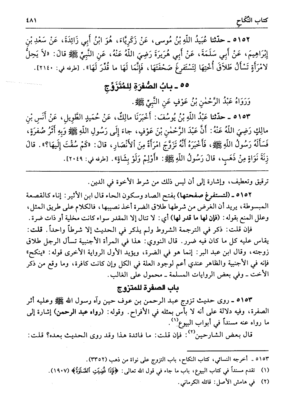 5153 - روى حديث تزوج عبد الرحمن بن عوف حين رآه رسول الله - صلى الله عليه وسلم - وعليه أثر الصفرة، وفيه دلالة على أنه لا بأس بمثله في الأفراح. وقوله: (رواه عبد الرحمن) إشارة إلى ما رواه عنه مسندًا في أبواب البيوع.