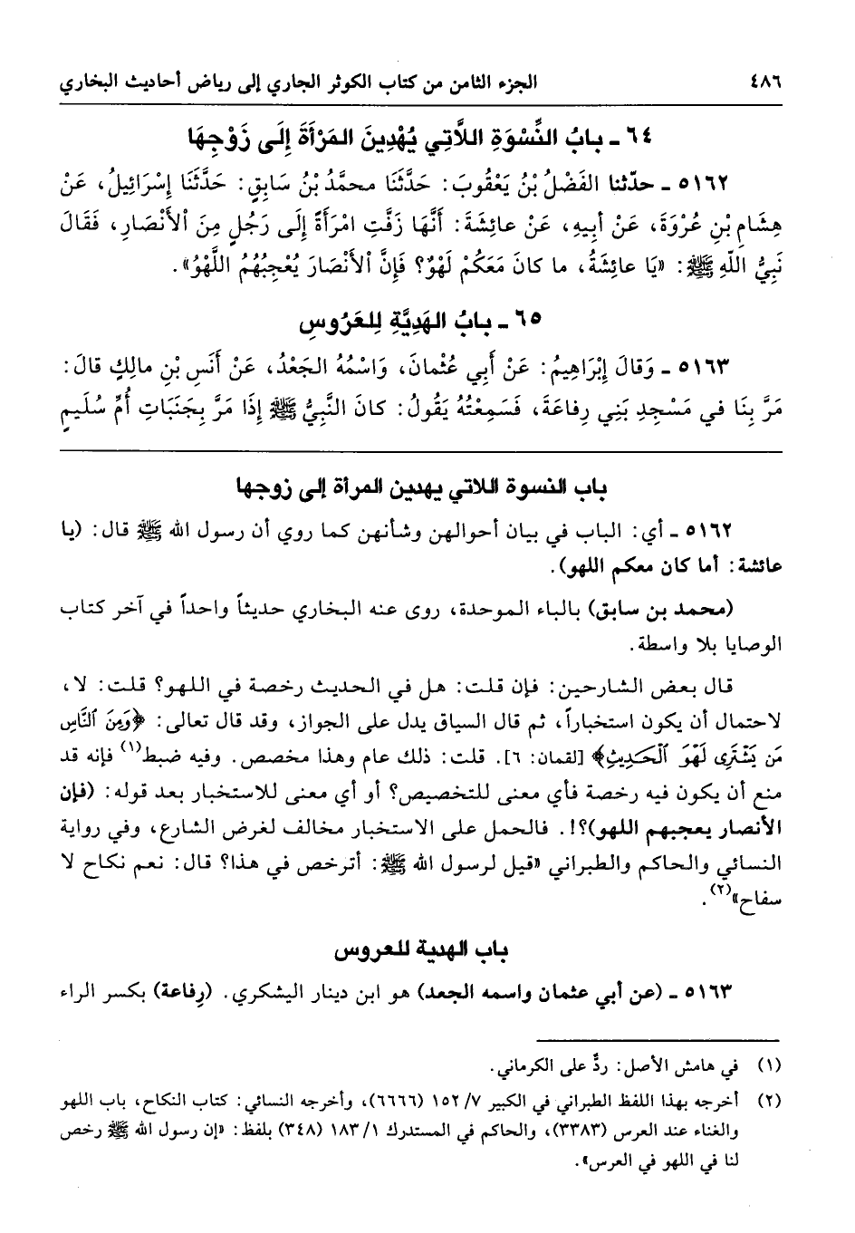 5162 - أي: الباب في بيان أحوالهن وشأنهن كما روي أن رسول الله - صلى الله عليه وسلم - قال: (يا عائشة: أما كان معكم اللهو).