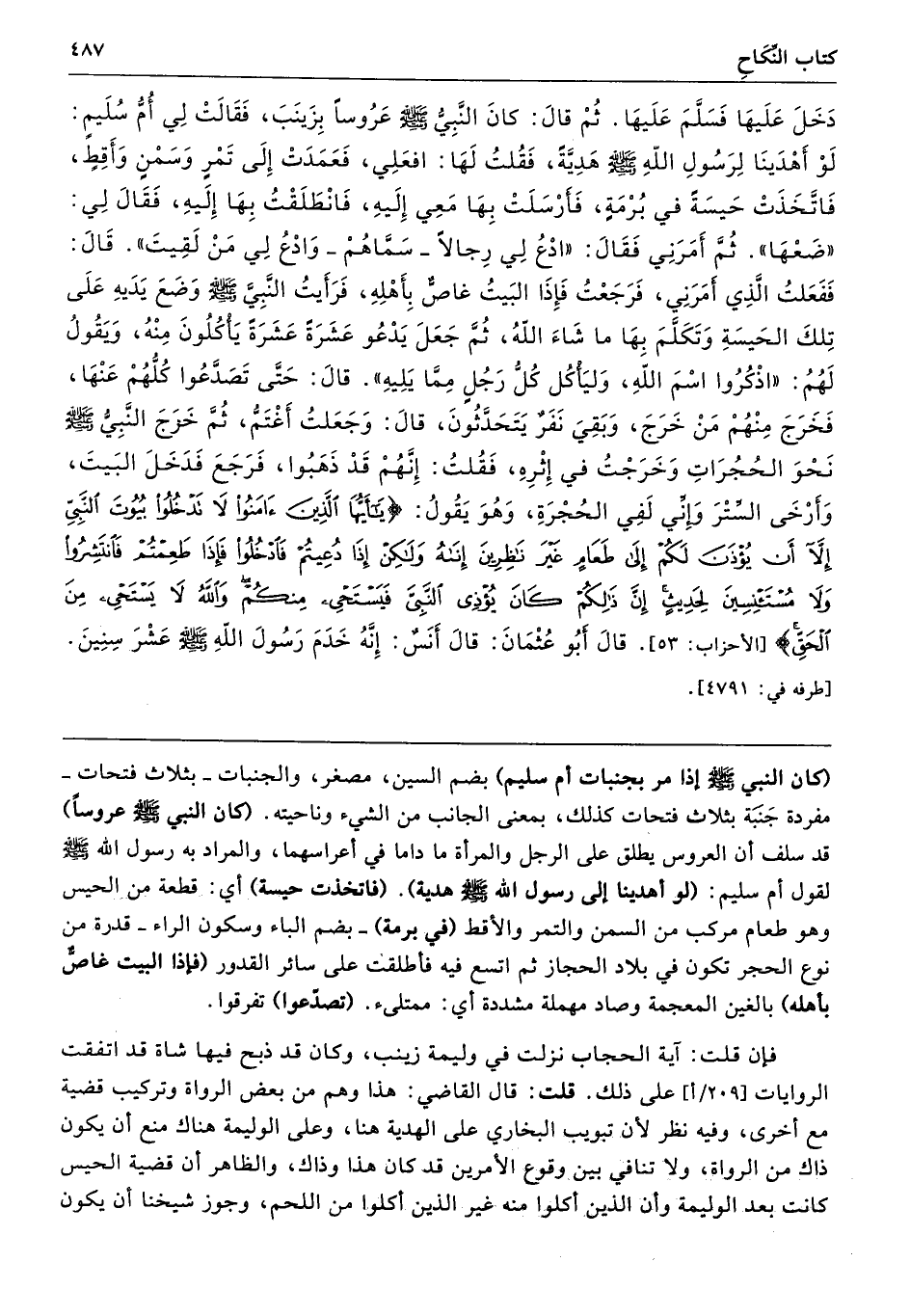 دَخَلَ عَلَيْهَا فَسَلَّمَ عَلَيْهَا، ثُمَّ قَالَ كَانَ النَّبِىُّ - صلى الله عليه وسلم - عَرُوسًا بِزَيْنَبَ فَقَالَتْ لِى أُمُّ سُلَيْمٍ لَوْ أَهْدَيْنَا لِرَسُولِ اللَّهِ - صلى الله عليه وسلم - هَدِيَّةً فَقُلْتُ لَهَا افْعَلِى. فَعَمَدَتْ إِلَى تَمْرٍ وَسَمْنٍ وَأَقِطٍ، فَاتَّخَذَتْ حَيْسَةً فِي بُرْمَةٍ، فَأَرْسَلَتْ بِهَا مَعِى إِلَيْهِ، فَانْطَلَقْتُ بِهَا إِلَيْهِ فَقَالَ لِى «ضَعْهَا». ثُمَّ أَمَرَنِى فَقَالَ «ادْعُ لِى رِجَالاً - سَمَّاهُمْ - وَادْعُ لِى مَنْ لَقِيتَ». قَالَ فَفَعَلْتُ الَّذِى أَمَرَنِى فَرَجَعْتُ فَإِذَا الْبَيْتُ غَاصٌّ بِأَهْلِهِ، فَرَأَيْتُ النَّبِىَّ - صلى الله عليه وسلم - وَضَعَ يَدَيْهِ عَلَى تِلْكَ الْحَيْسَةِ، وَتَكَلَّمَ بِهَا مَا شَاءَ اللَّهُ، ثُمَّ جَعَلَ يَدْعُو عَشَرَةً عَشَرَةً، يَأْكُلُونَ مِنْهُ، وَيَقُولُ لَهُمُ «اذْكُرُوا اسْمَ اللَّهِ، وَلْيَأْكُلْ كُلُّ رَجُلٍ مِمَّا يَلِيهِ». قَالَ حَتَّى تَصَدَّعُوا كُلُّهُمْ عَنْهَا، فَخَرَجَ مِنْهُمْ مَنْ خَرَجَ، وَبَقِىَ نَفَرٌ يَتَحَدَّثُونَ قَالَ وَجَعَلْتُ أَغْتَمُّ، ثُمَّ خَرَجَ النَّبِىُّ - صلى الله عليه وسلم - نَحْوَ الْحُجُرَاتِ، وَخَرَجْتُ فِي إِثْرِهِ فَقُلْتُ إِنَّهُمْ قَدْ ذَهَبُوا. فَرَجَعَ فَدَخَلَ الْبَيْتَ، وَأَرْخَى السِّتْرَ، وَإِنِّى لَفِى الْحُجْرَةِ، وَهْوَ يَقُولُ (يَا أَيُّهَا الَّذِينَ آمَنُوا لاَ تَدْخُلُوا بُيُوتَ النَّبِيِّ إِلاَّ أَنْ يُؤْذَنَ لَكُمْ إِلَى طَعَامٍ غَيْرَ نَاظِرِينَ إِنَاهُ وَلَكِنْ إِذَا دُعِيتُمْ فَادْخُلُوا فَإِذَا طَعِمْتُمْ فَانْتَشِرُوا وَلاَ مُسْتَأْنِسِينَ لِحَدِيثٍ إِنَّ ذَلِكُمْ كَانَ يُؤْذِى النَّبِىَّ فَيَسْتَحْيِى مِنْكُمْ وَاللَّهُ لاَ يَسْتَحْيِى مِنَ الْحَقِّ). قَالَ أَبُو عُثْمَانَ قَالَ أَنَسٌ إِنَّهُ خَدَمَ رَسُولَ اللَّهِ - صلى الله عليه وسلم - عَشْرَ سِنِينَ. طرفه 4791