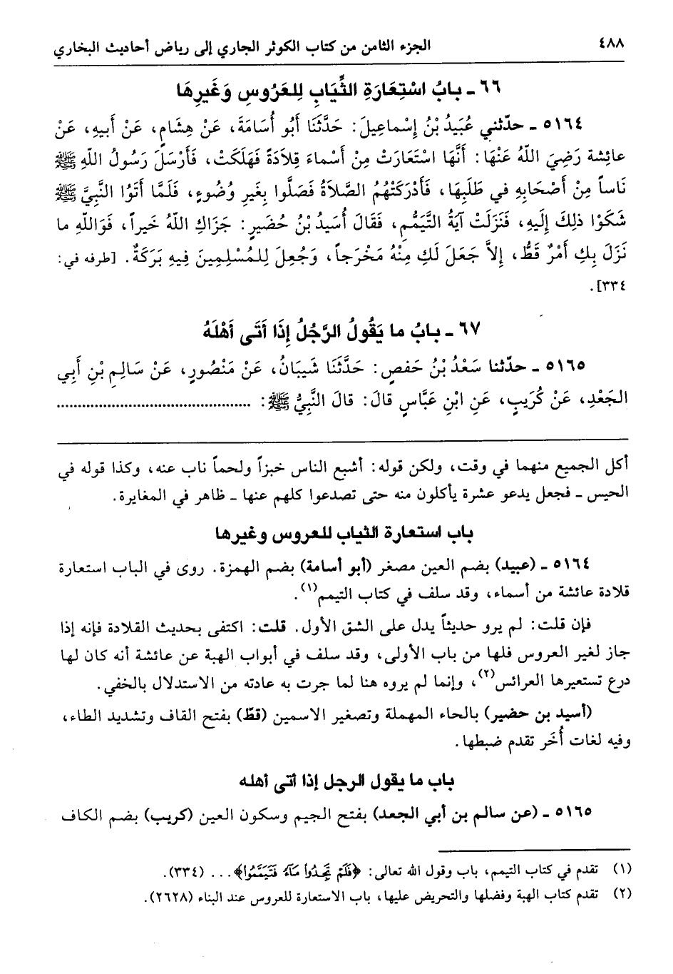 5164 - (عبيد) بضم العين مصغر (أبو أسامة) بضم الهمزة. روى في الباب استعارة قلادة عائشة من أسماء، وقد سلف في كتاب التيمم.