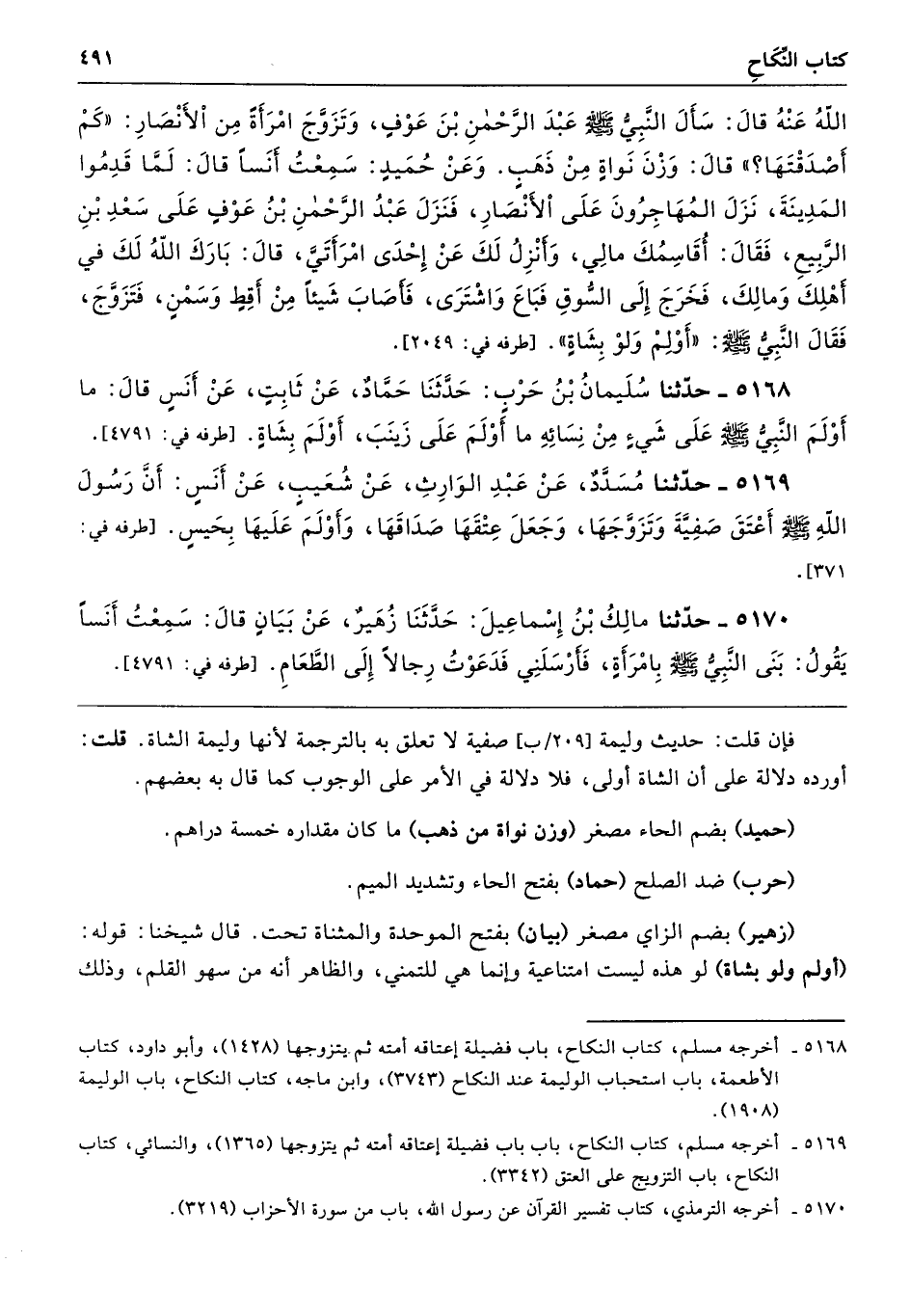 (زهير) بضم الزاي مصغر (بيان) بفتح الموحدة والمثناة تحت. قال شيخنا: قوله: (أولم ولو بشاة) لو هذه ليست امتناعية وإنما هي للتمني، والظاهر أنه من سهو القلم، وذلك